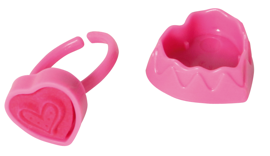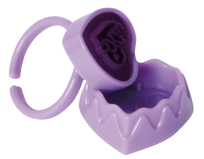 Süßer Stempelring mit Glitzerherz und Selbstfärbendem Stempel. Verschiedene Ringfarben und Stempeldesigns sortiert.