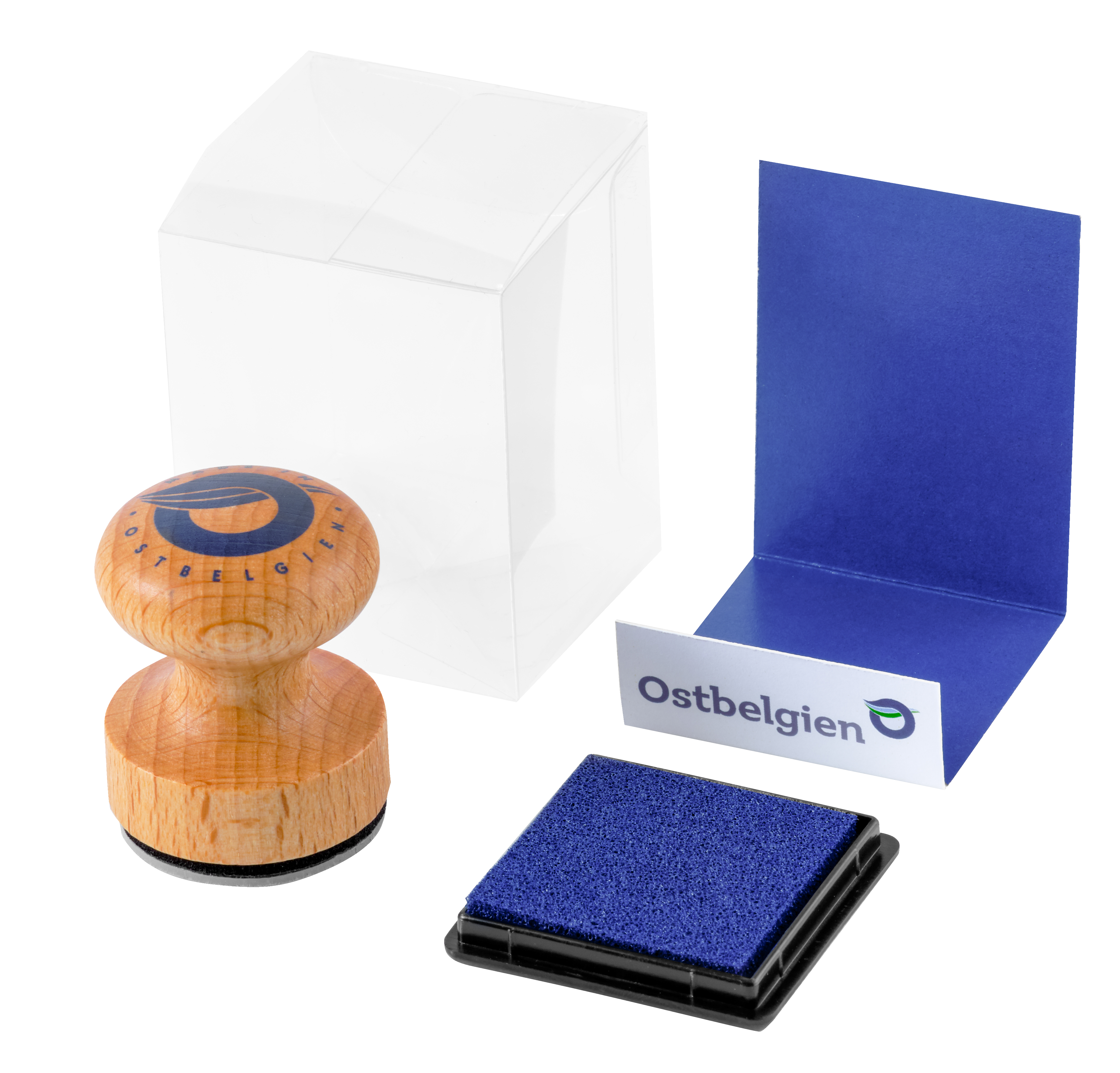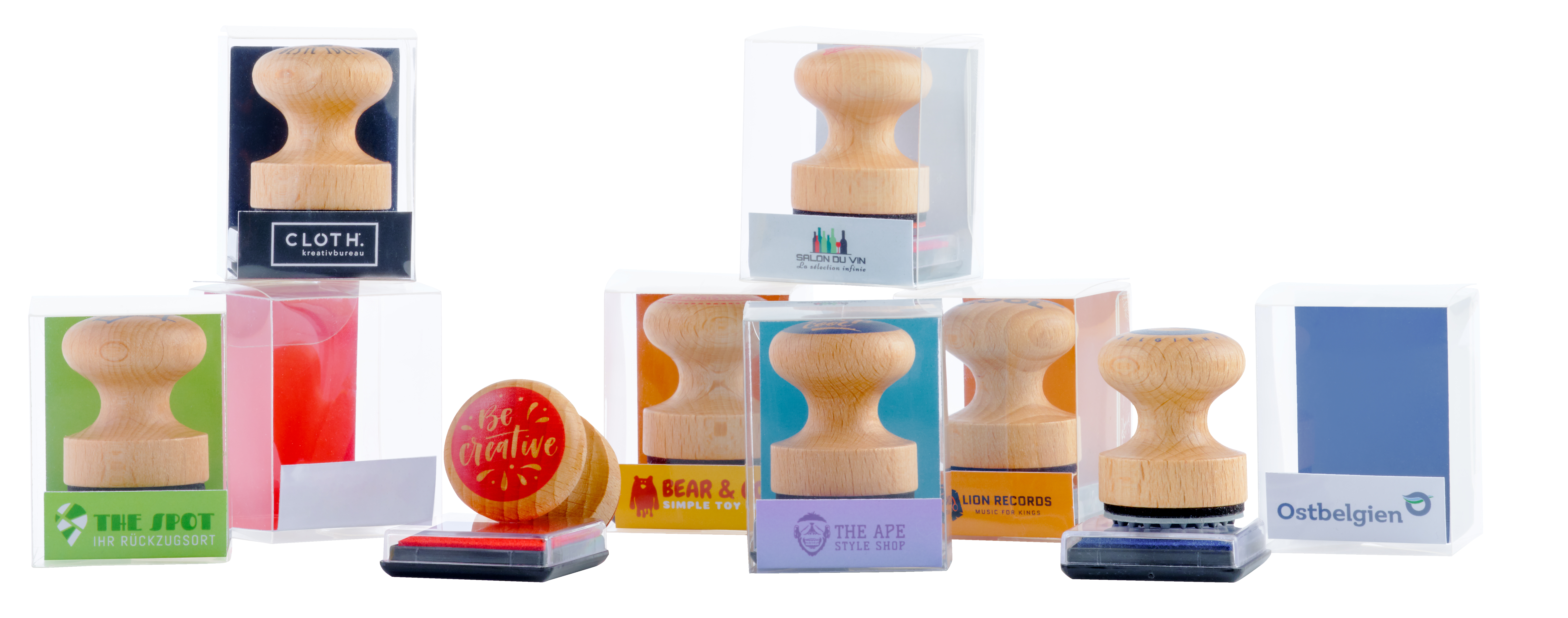 Der Holzgriff, mit einem Durchmesser von 30 mm, wird aus Buchenholz mit UV-beständigem, seidenmattem Wasserlack hergestellt. Die Gummiplatten bestehen aus 100 % Naturgummi und werden individuell hergestellt. Das Stempelmotiv ist oben auf den Griff gedruckt. Mit in der Box ist ein Stempelkissen mit 40 x 40 mm. Zur Auswahl stehen die Stempelfarben schwarz – rot – blau. Zusammen verpackt in einer PET Klarsicht- box mit einem beidseitig bedruckten Einleger für die individuelle Werbebotschaft. Ideal für Ihre Markendarstellung.