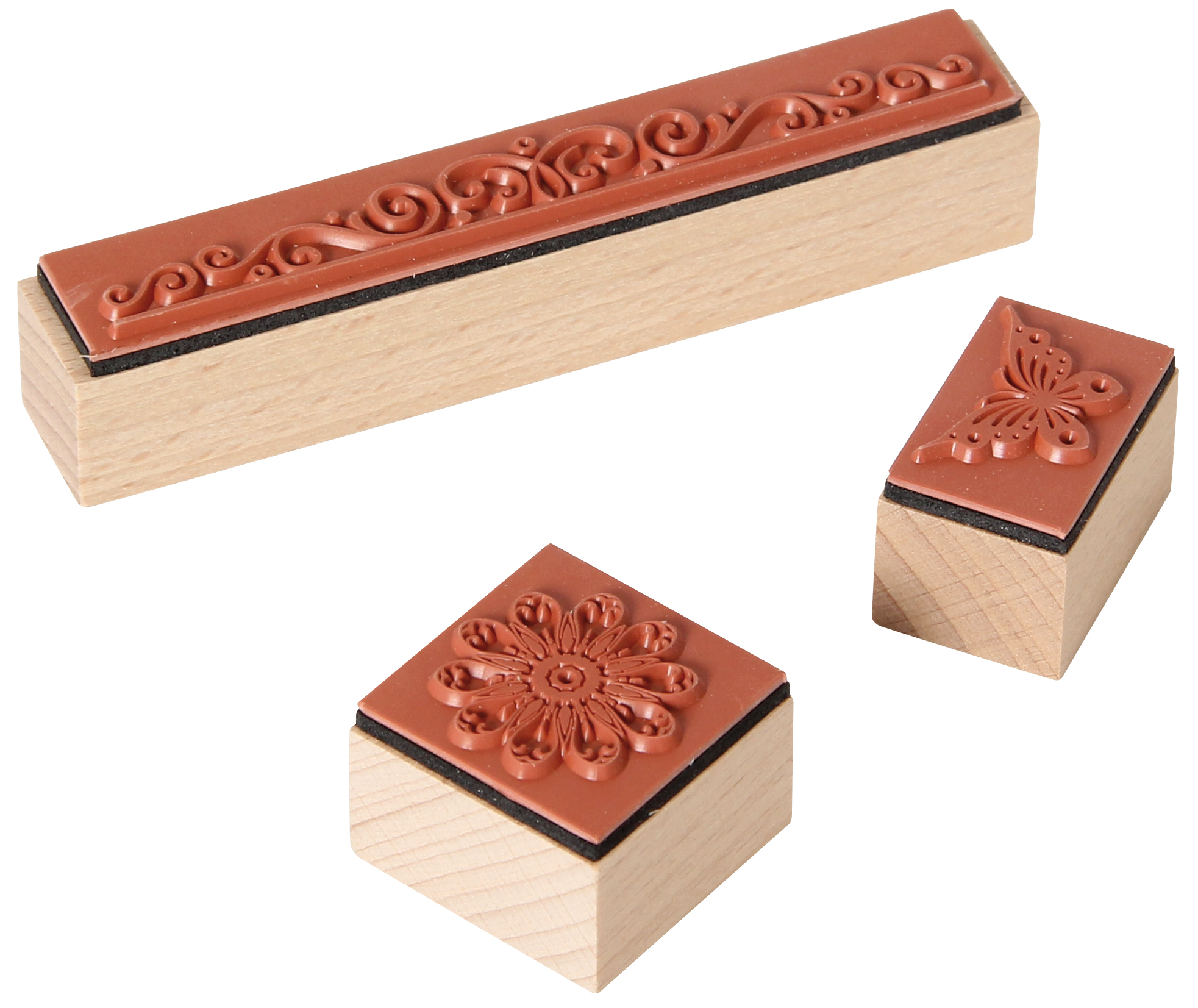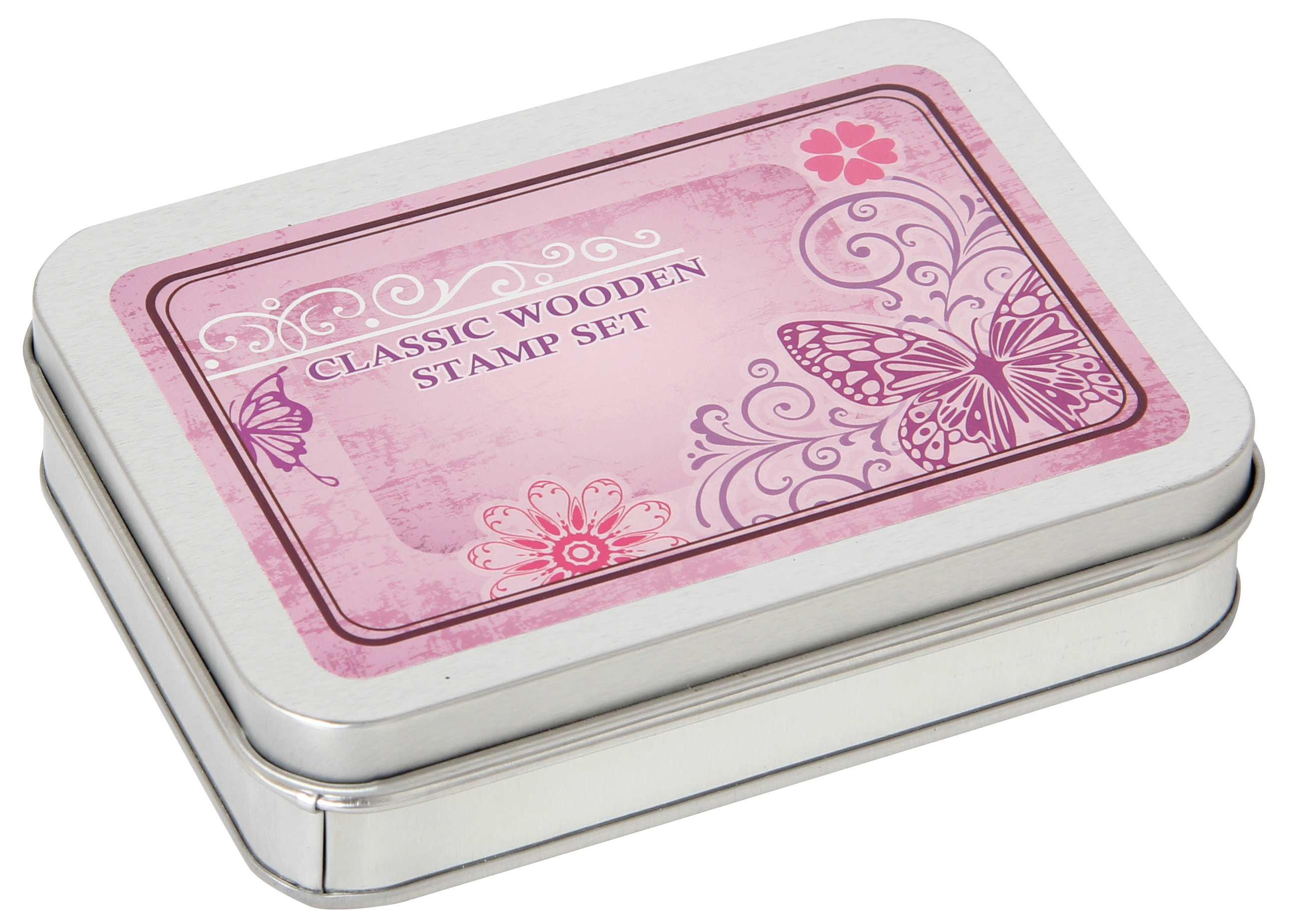 Acht verschieden große Holzstempel in exklusiver Metalldose.