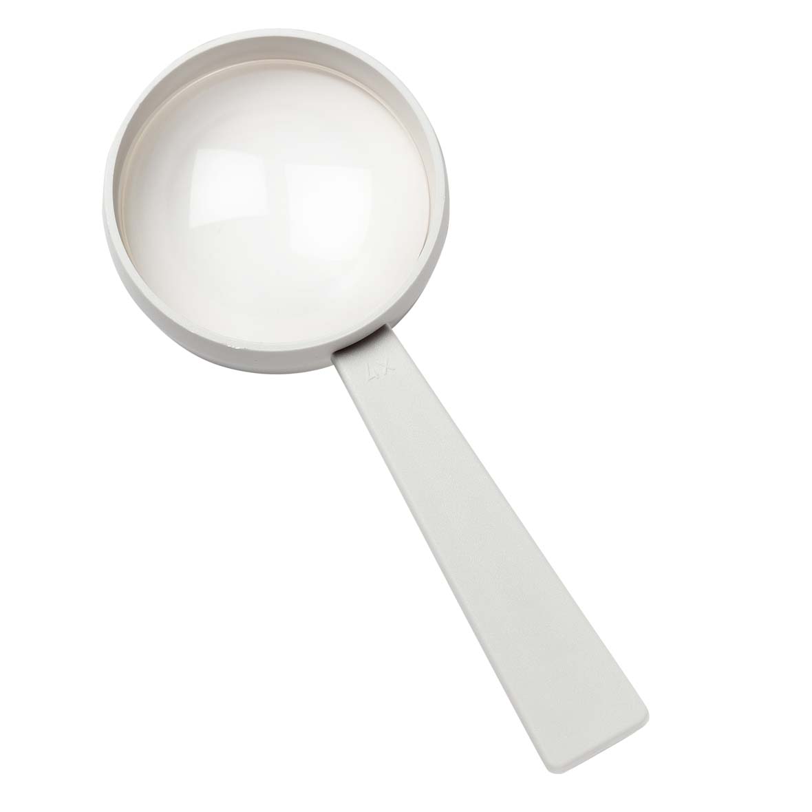 Lupe aus stabilem Kunststoff mit einem Durchmesser von 60 mm, 4-facher Vergrößerung und Stiel zum bequemen Halten. Mit spezieller, asphärischer Linse.
