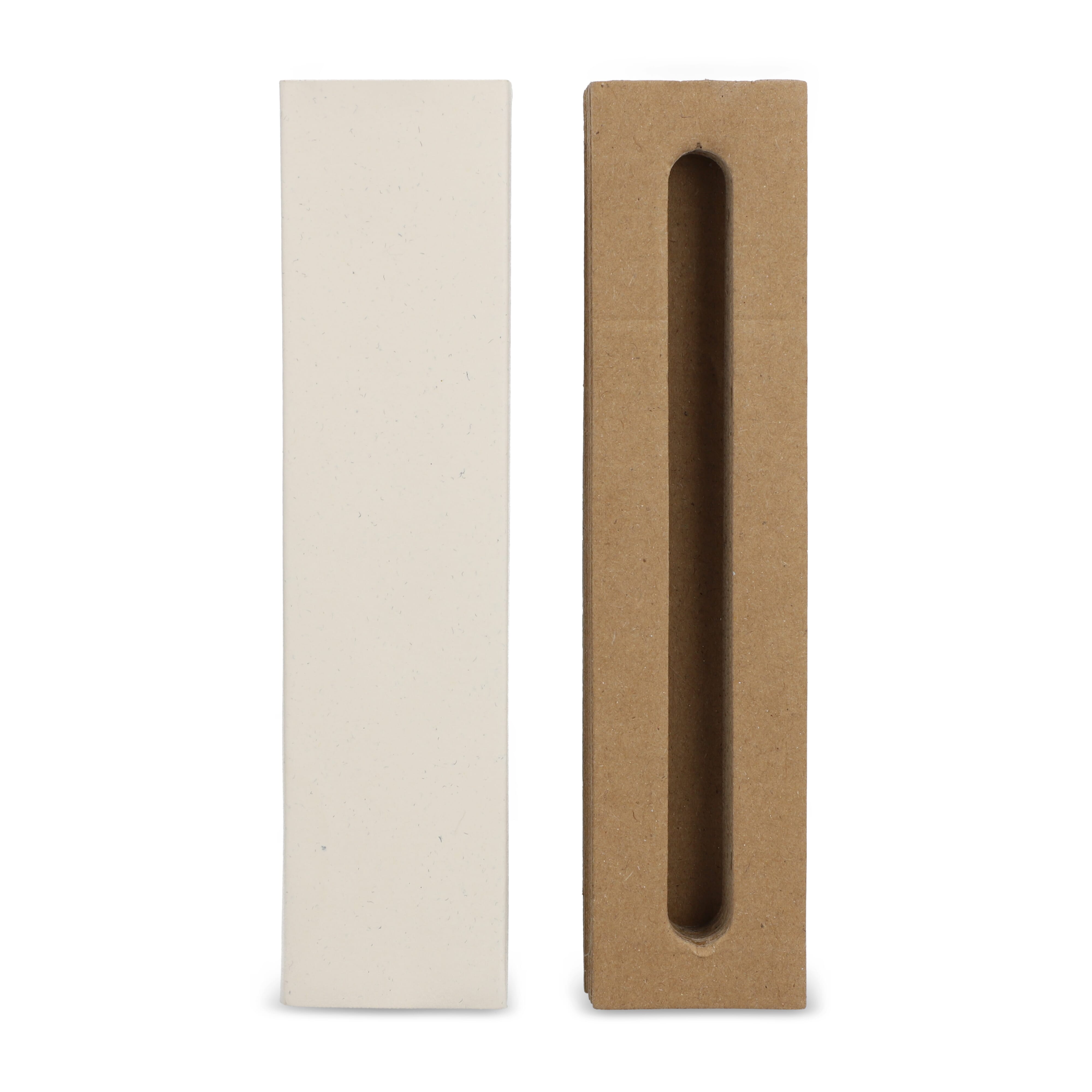 Stiftebox für einen Stift, hergestellt aus recycelten Milchkartons.