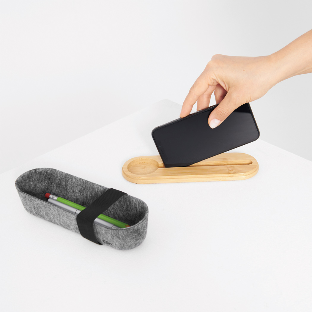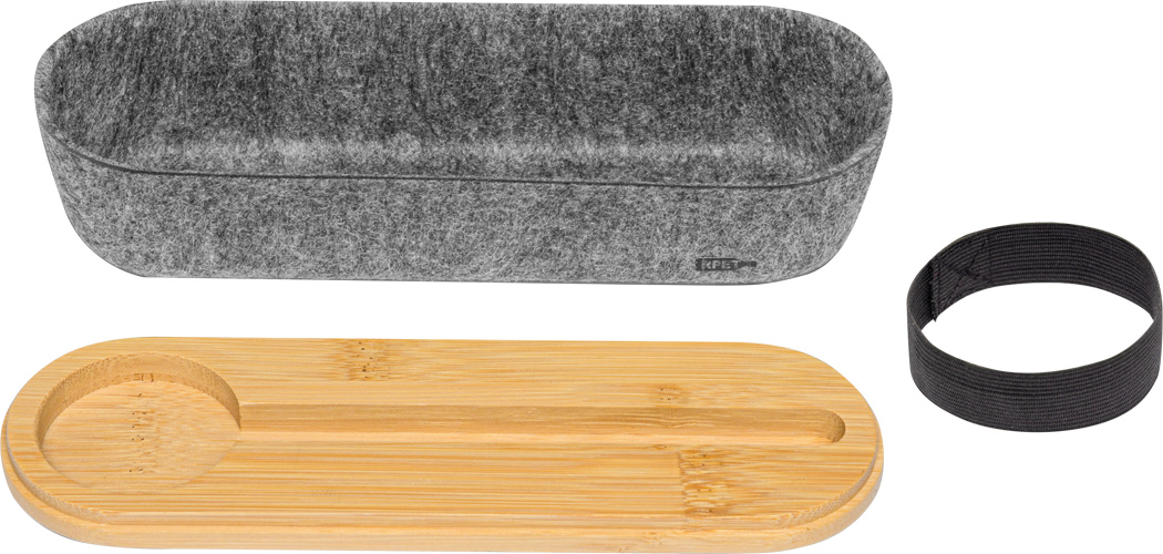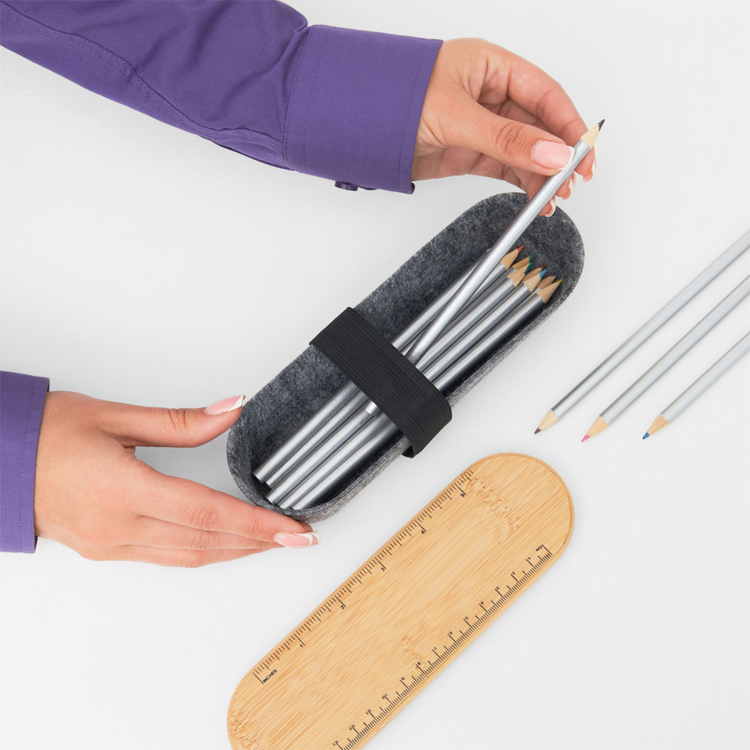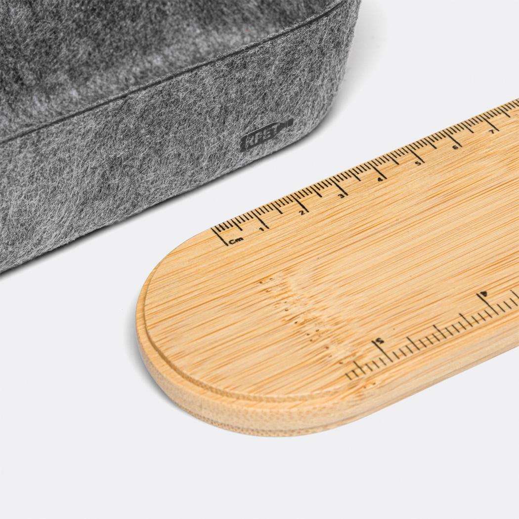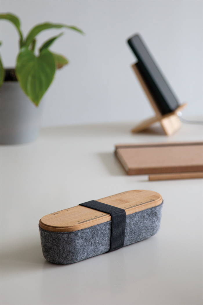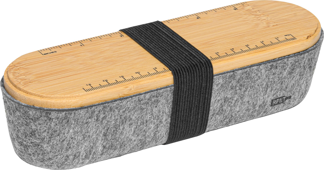 Stifteetui PEN STORE aus RPET-Filz mit Deckel aus Bambus und Elastikband, Deckel mit Lineal (cm und inch) sowie Telefonhalter auf der Rückseite