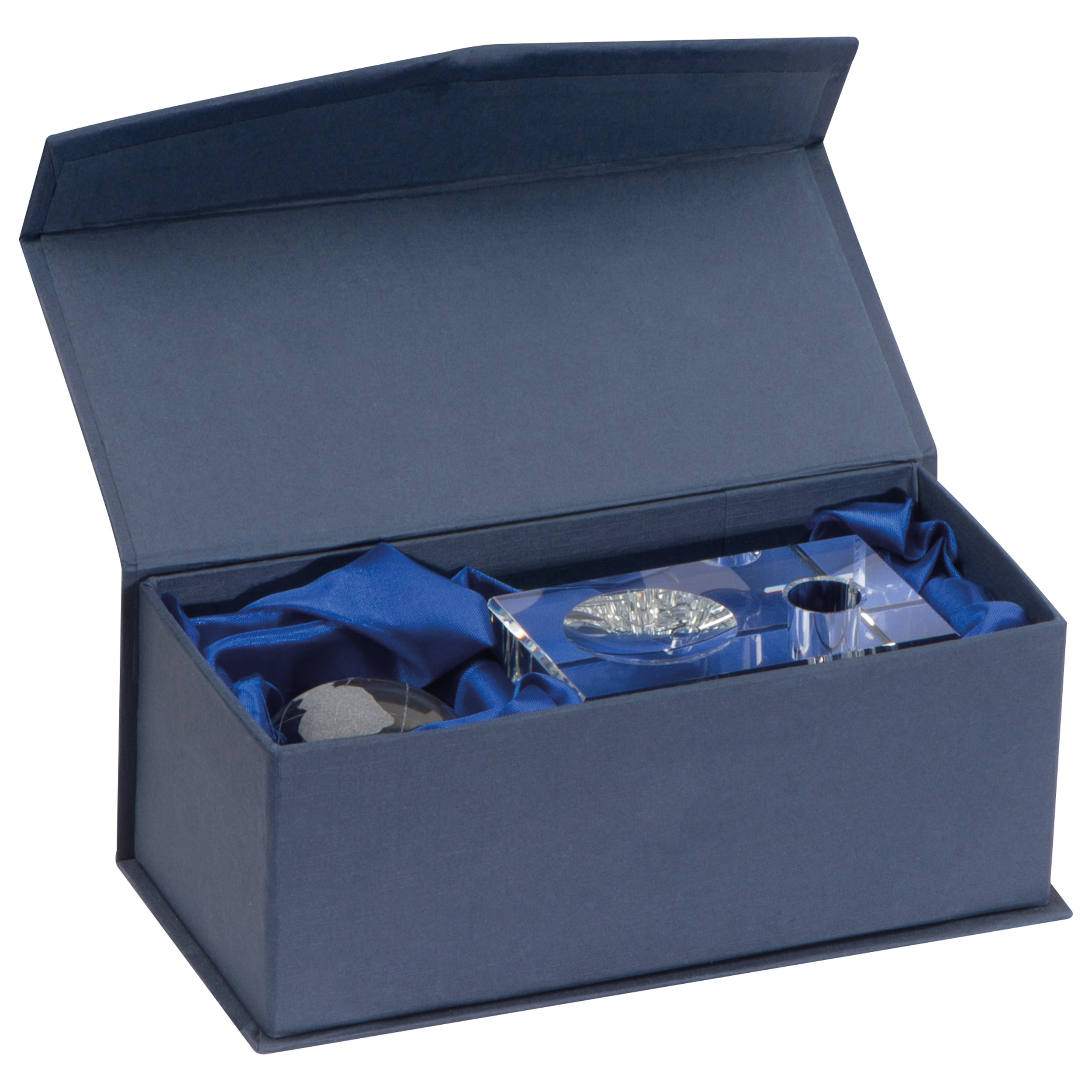 Massiver Stiftehalter aus Glas mit abnehmbarer Weltkugel. Sicher in einer blauen Box verpackt. Ihre Werbung lasern wir von hinten auf das Glas.