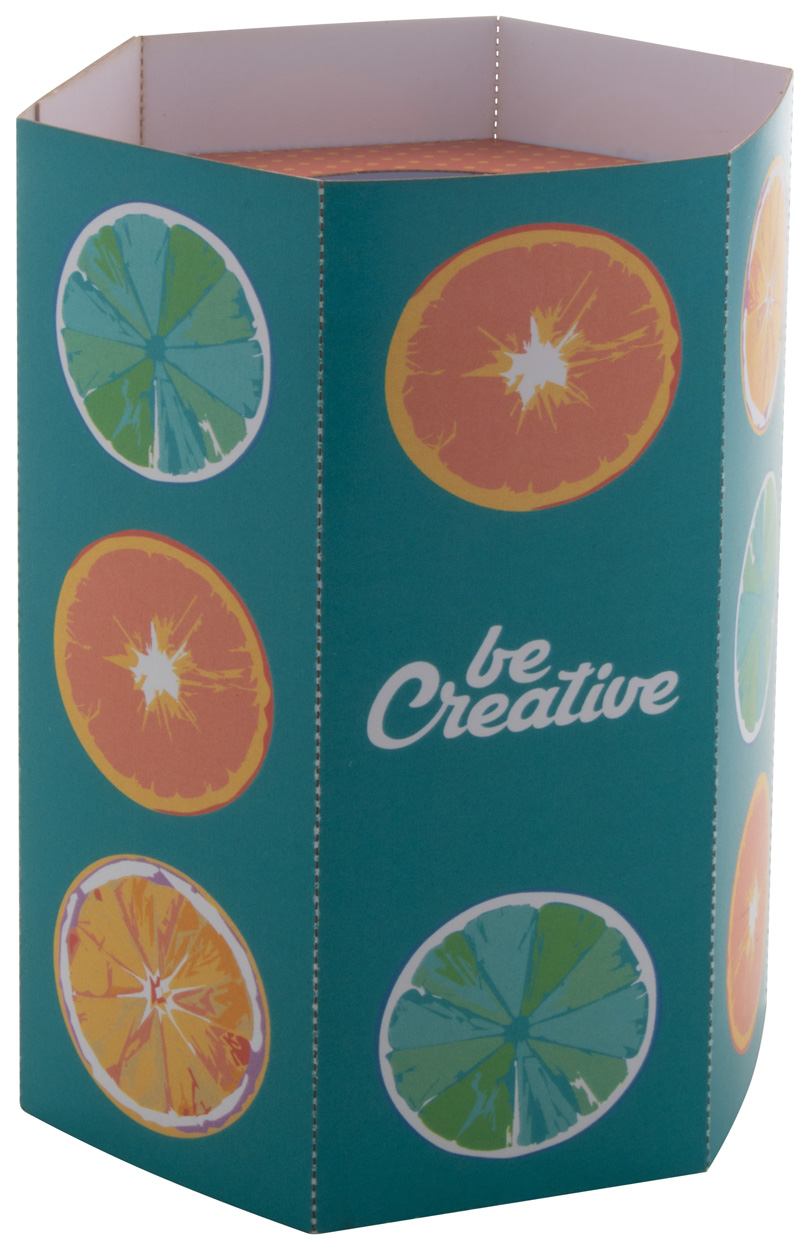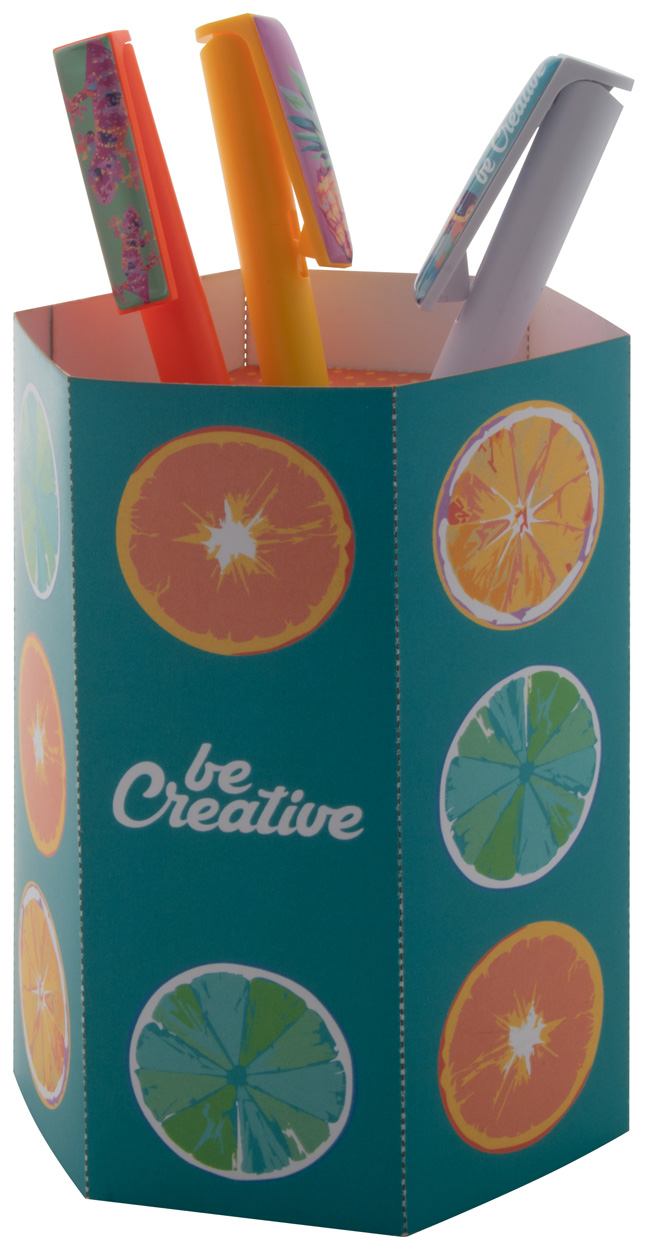 Individueller, sechseckiger Stifteköcher aus Pappe. Preis inkl. Vollfarbdruck. Mindestmenge: 100 Stk.