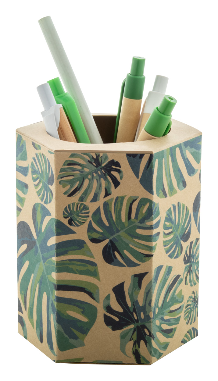 Individueller, sechseckiger Stifteköcher aus Kraftpapier. Preis inkl. Vollfarbdruck. Die Lieferung erfolgt flach verpackt. Mindestmenge: 100 Stk.