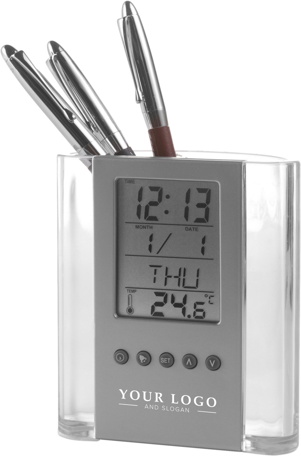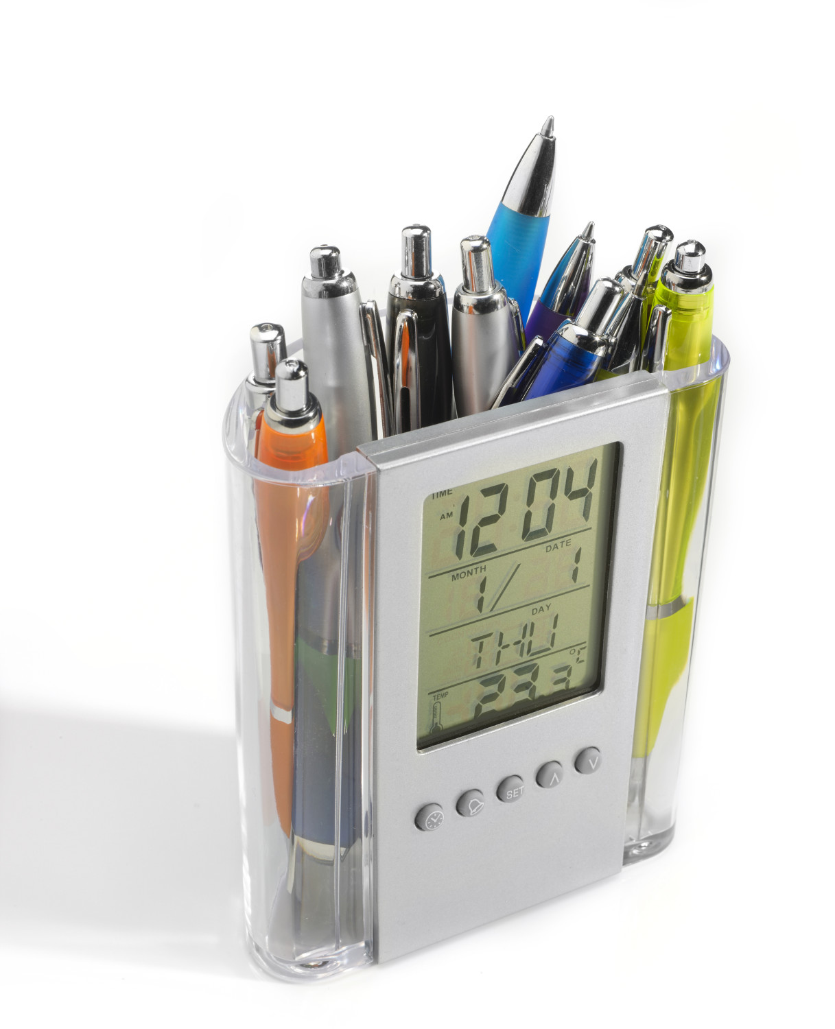 Stifteköcher aus transparentem Kunststoff, mit Uhrzeitanzeige, Kalenderfunktion und Temperaturanzeige.