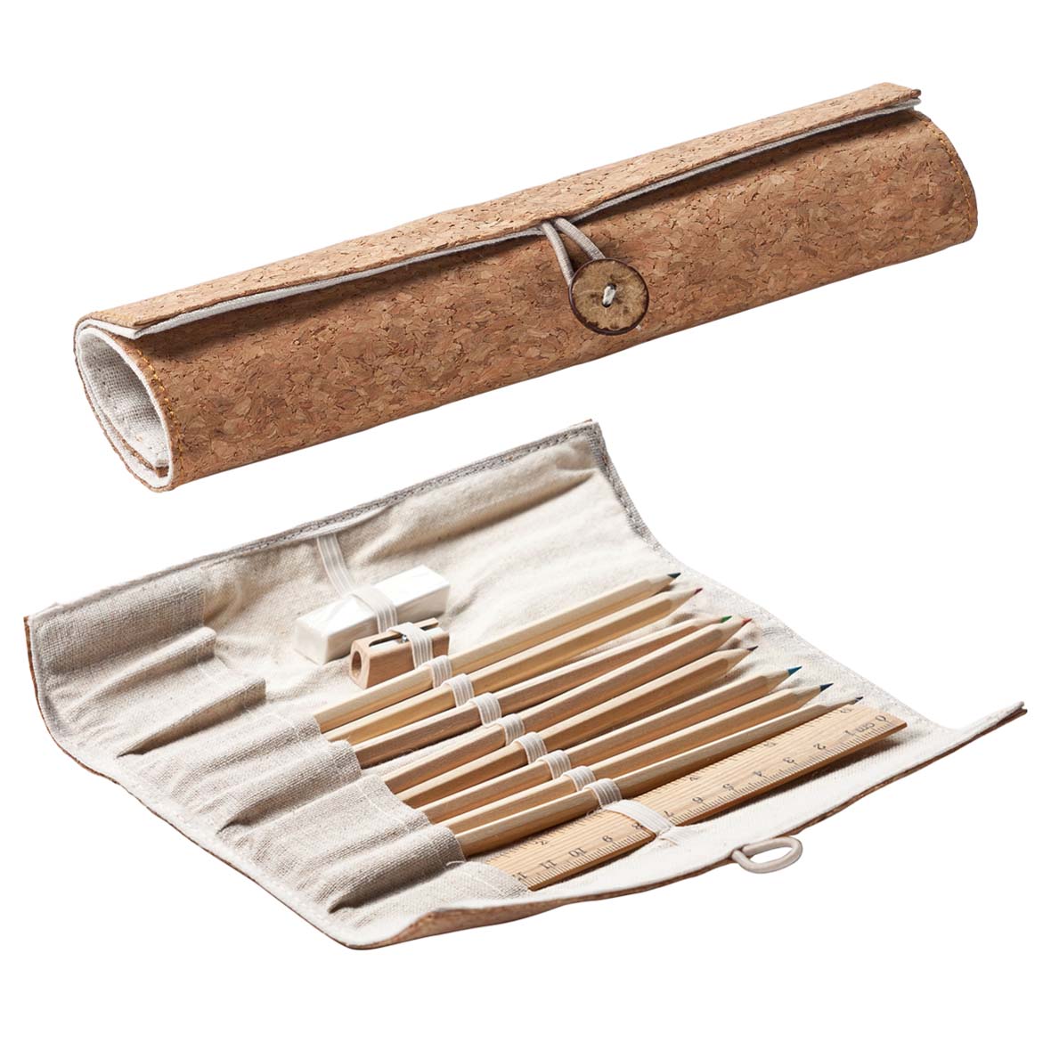 Flexibler Kork. Stifte-Rolle mit Naturkork bezogen. Die Innenseite ist aus leinenfarbenem Textil und beinhaltet einen Radiergummi, einen Spitzer, ein Holzlineal und 12 Buntstifte aus naturbelassenem Holz. Der Überschlag verhindert ein Herausfallen von Utensilien. Verschlossen wird die Rolle mittels Knopf und Gummischlaufe.