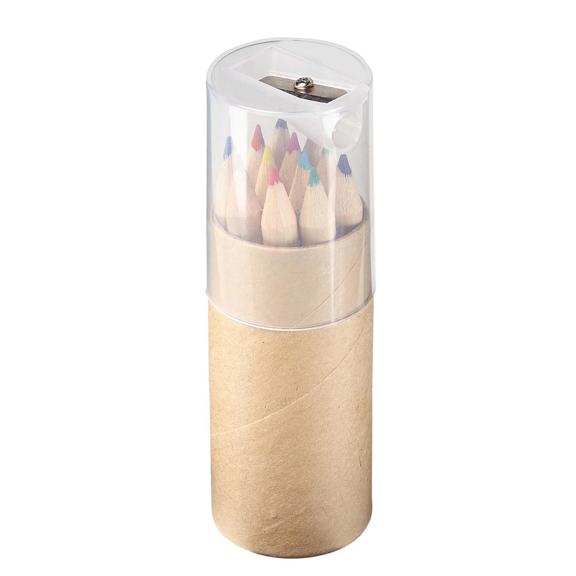 Handliches 2in1-Set mit 12 kurzen, unlackierten Holz-Buntstiften im Pappzylinder mit transparentem Kunststoffdeckel und integriertem Spitzer.