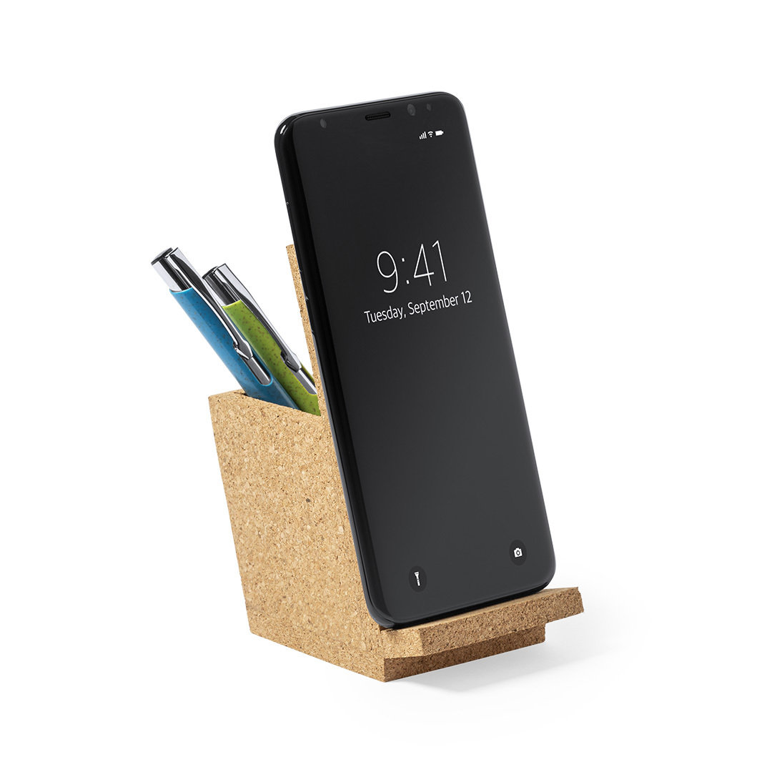 Linie "Natur" Stifthalter mit integriertem Smartphone-Halter. Hergestellt aus Kork, um die Verwendung von natürlichen Rohstoffen zu fördern, und präsentiert in einer attraktiven Öko-Design-Box.