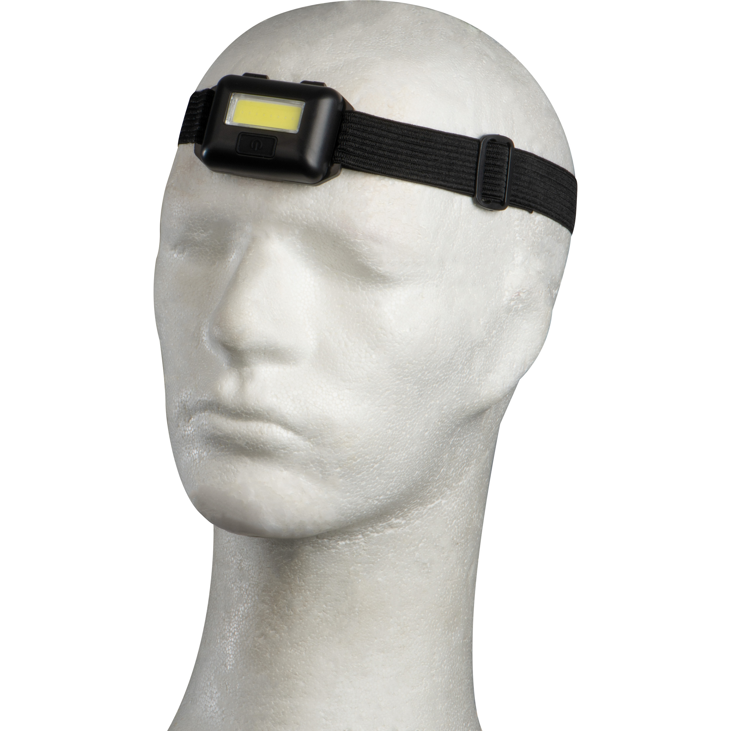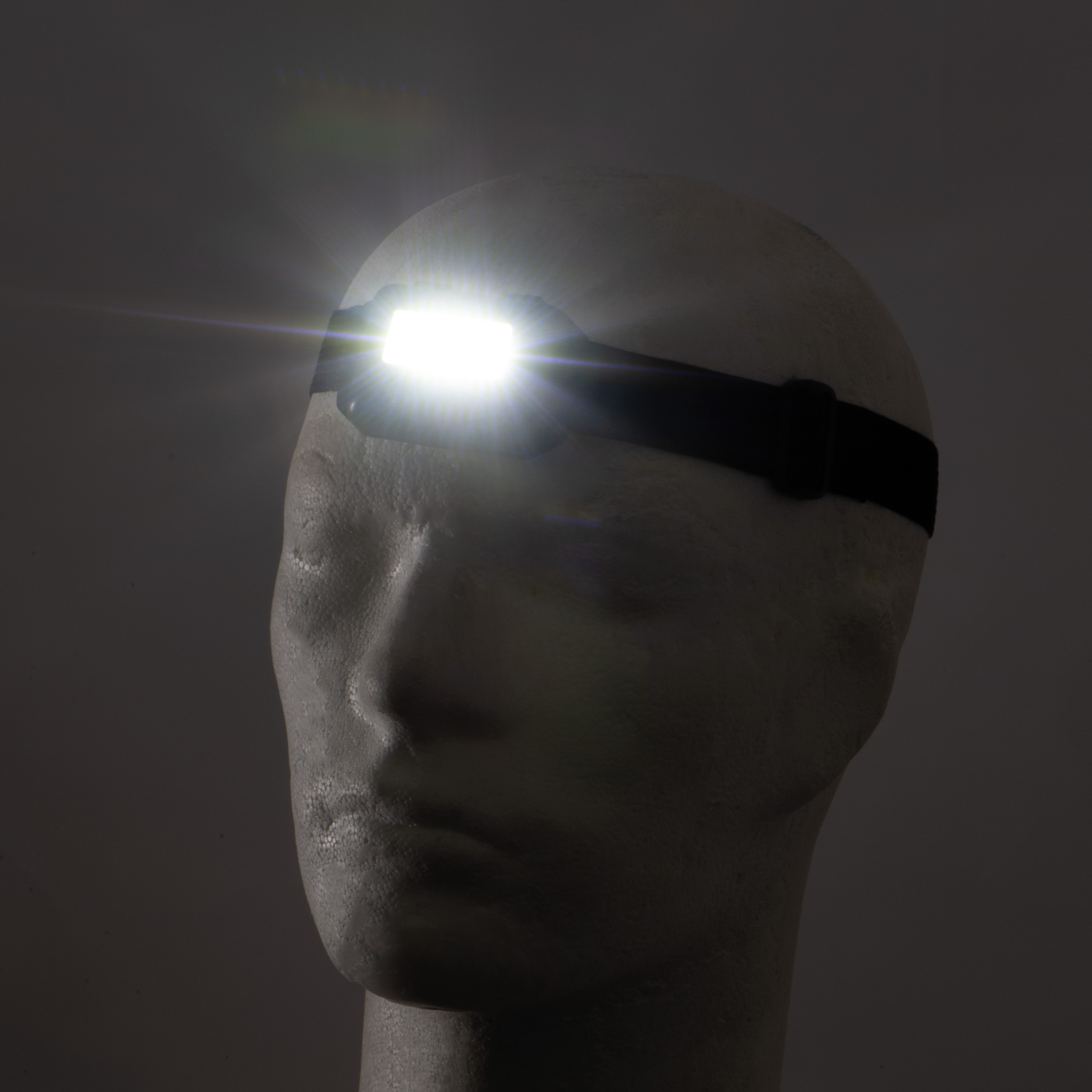 COB Stirnlampe mit verstellbarem Gummiband und einer Leistung von 3 Watt. Die Lampe hat eine Stand-, Blink- und dimmbare Leuchtfunktion. Ihre Werbung wird auf die Vorderseite der Lampe gedruckt.