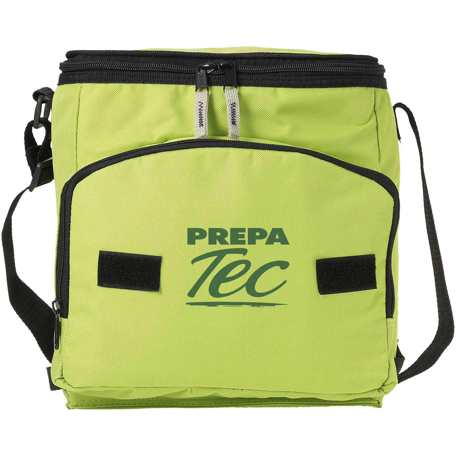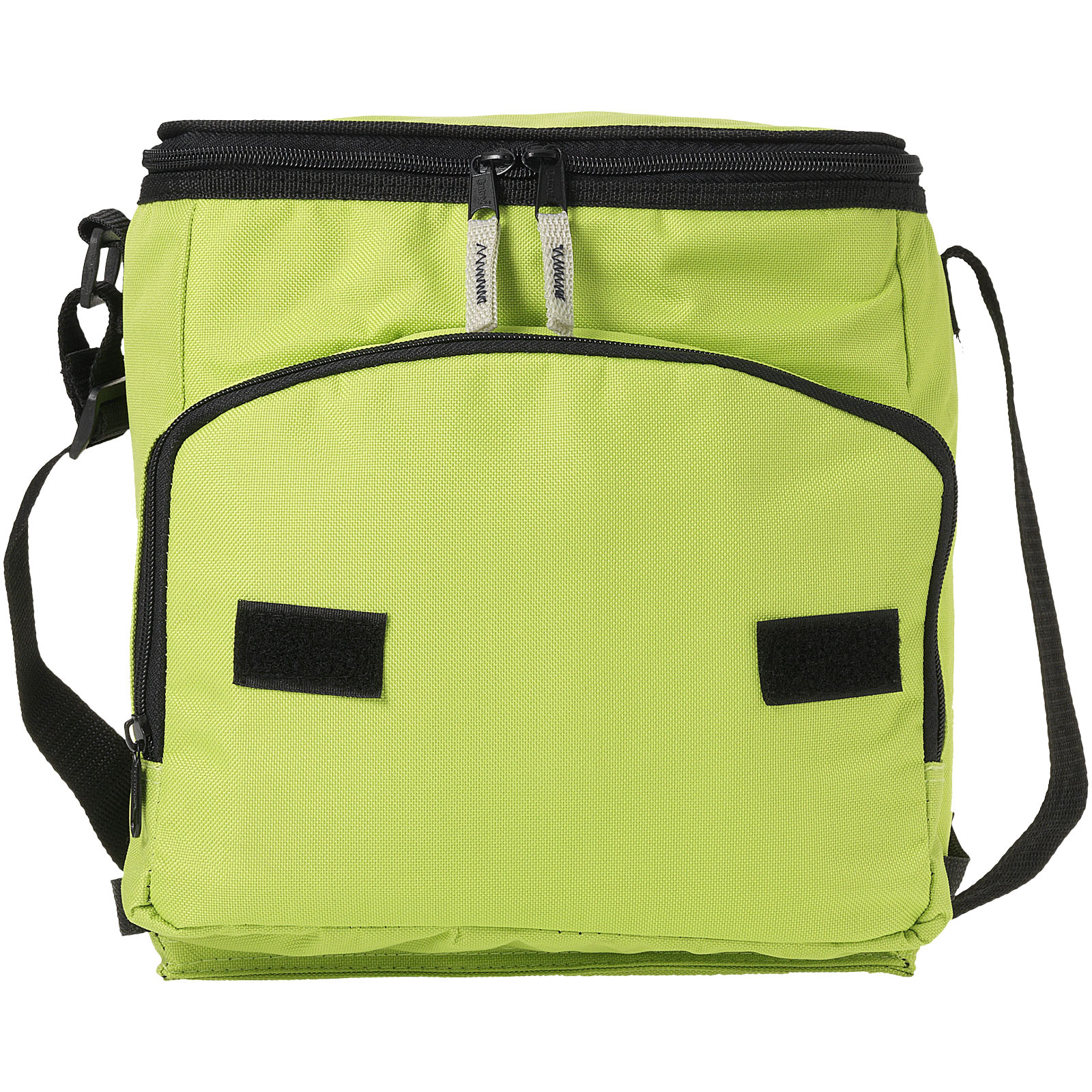 Zusammenfaltbare Kühltasche mit Hauptfach mit Reißverschluss und Fronttasche mit Reißverschluss. Verstellbarer Schulterriemen. Die Kühltasche kann dank des Klettverschlusses an der Fronttasche flach zusammengefaltet werden.