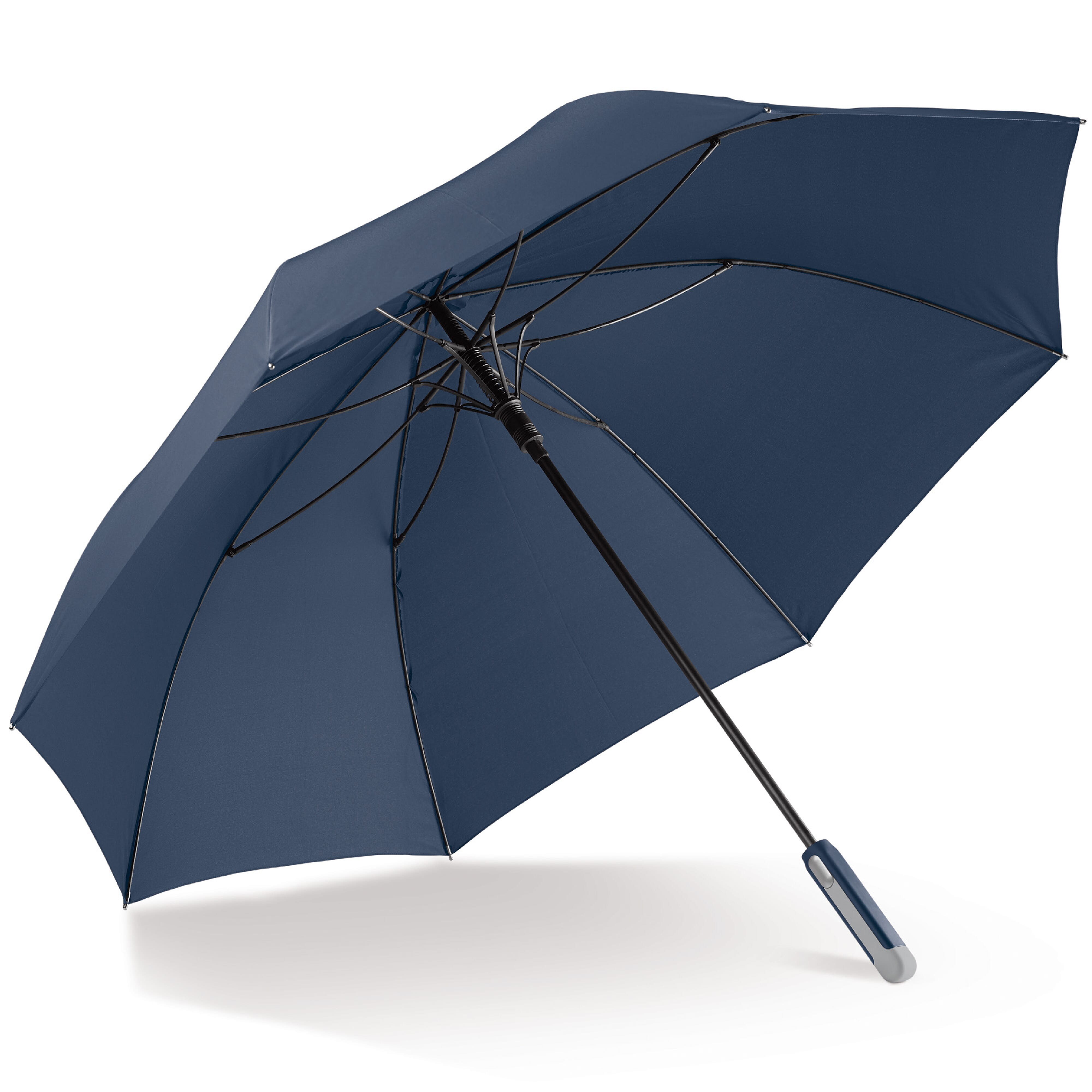 Großer Regenschirm mit winddichtem Fiberglasgestell. Der pfiffige Farbeffekt zwischen der Pongee-Polyesterkappe und dem ergonomischen Griff verleiht dem Schirm einen zeitlosen Look. Damit ist er für jeden geeignet.