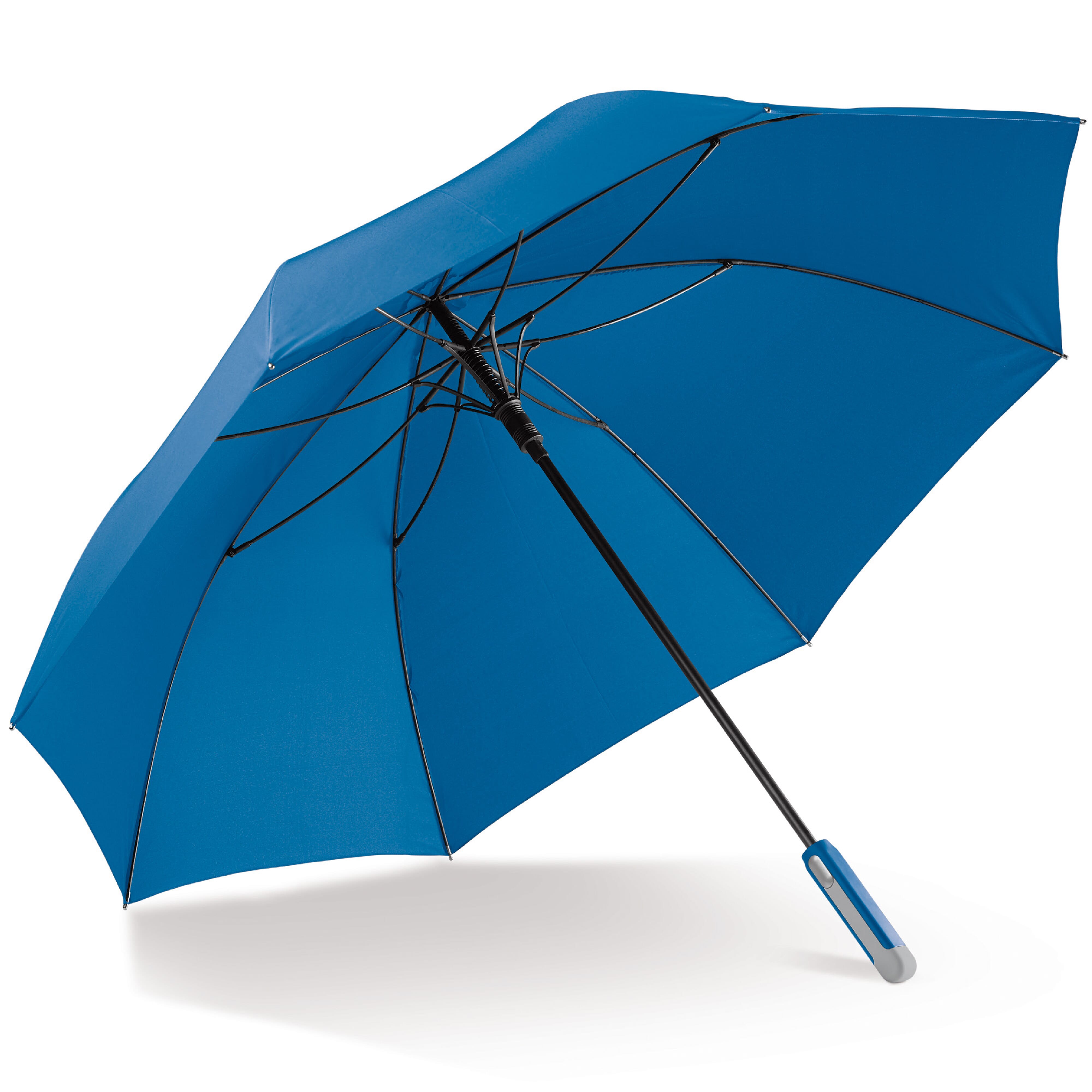 Großer Regenschirm mit winddichtem Fiberglasgestell. Der pfiffige Farbeffekt zwischen der Pongee-Polyesterkappe und dem ergonomischen Griff verleiht dem Schirm einen zeitlosen Look. Damit ist er für jeden geeignet.