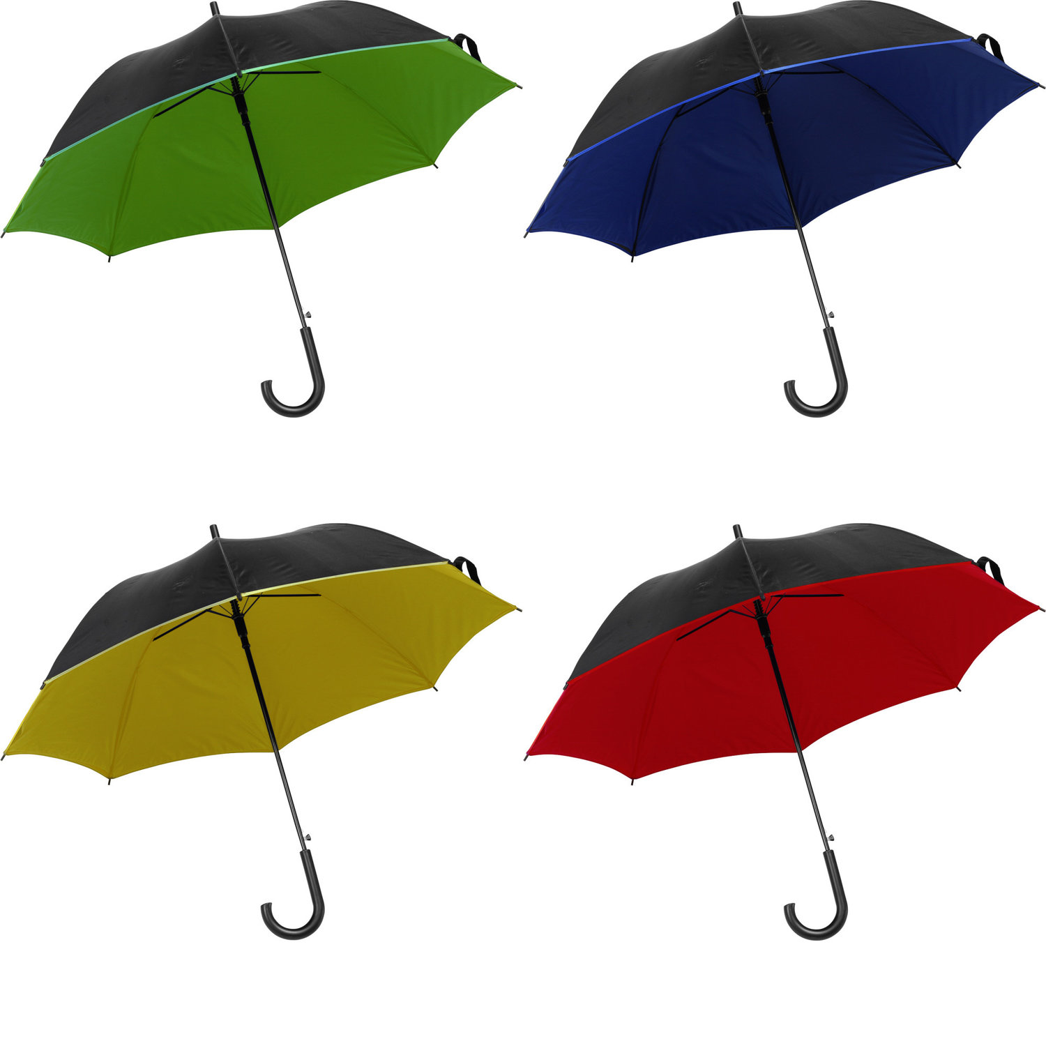 Automatik-Stockschirm aus Polyester (190T), mit Krücke aus Kunststoff, Schaft, Gestell, Spitze aus Metall und Tips aus Kunststoff.