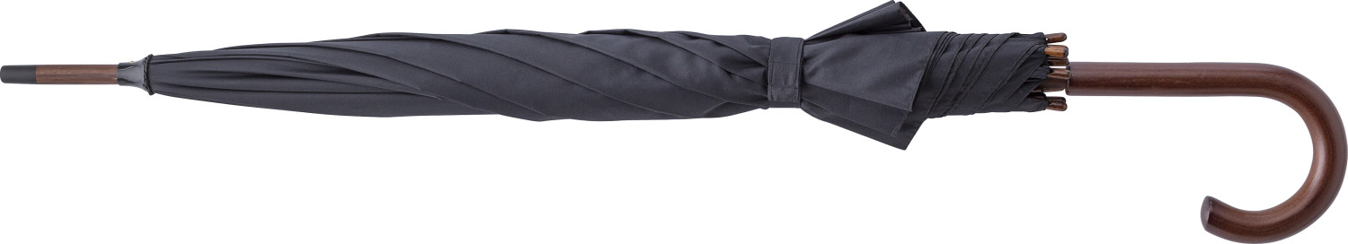 Regenschirm mit einer Bespannung aus rPET (170T), einen Handgriff aus Kunststoff und einen Rahmen aus Fiberglas.