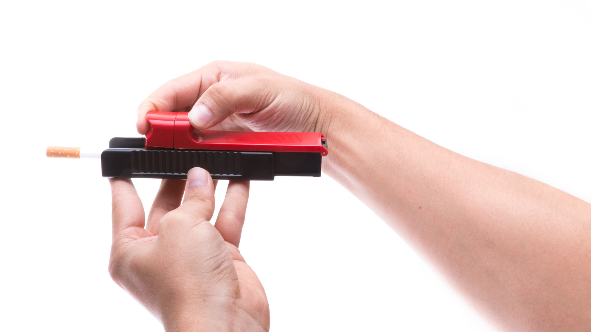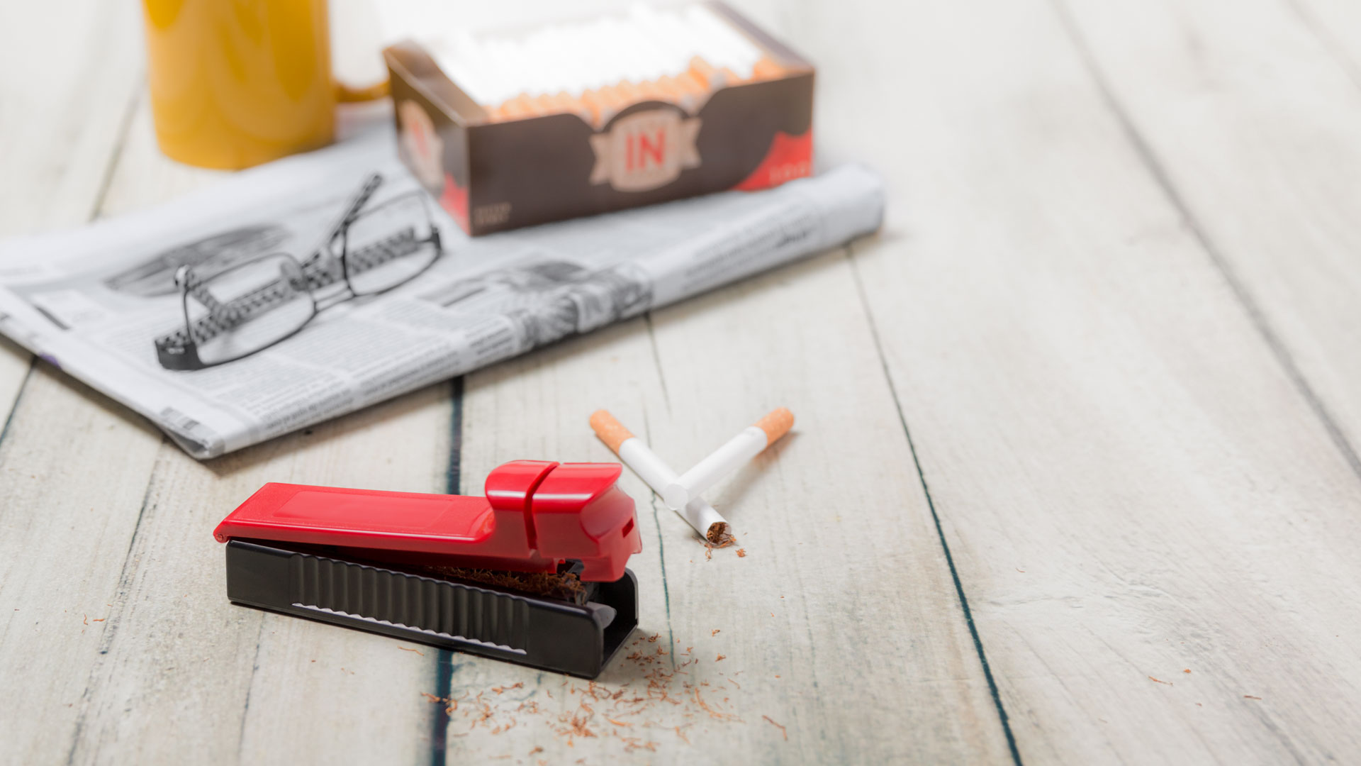 Stopfmaschine für Tabak mit zweifarbigem Design in verschiedenen Farben. Präsentiert in einer individuellen Designbox.