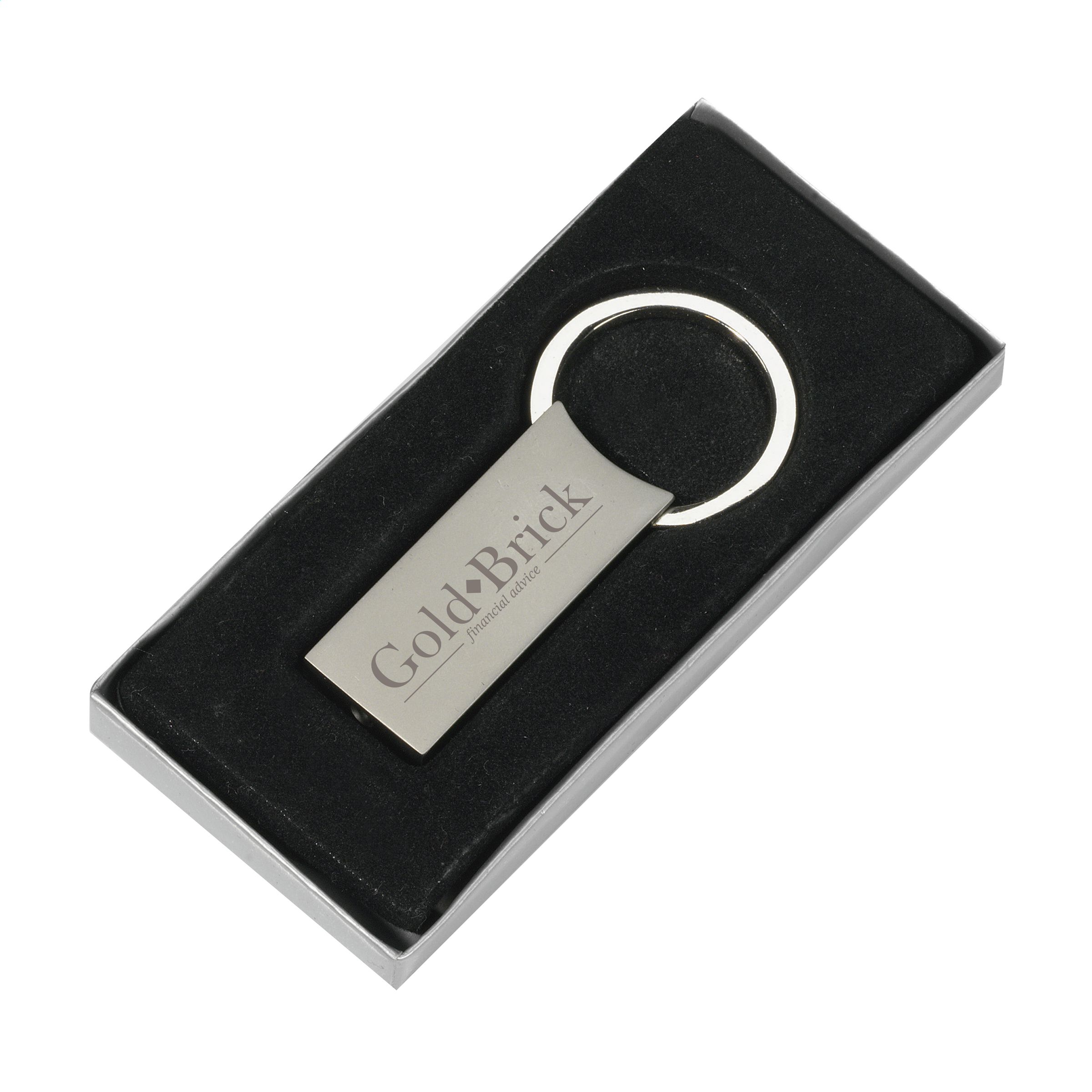 Mattmetallener Schlüsselanhänger mit stabilem Sicherheitsring mit Klicksystem. Wird einzeln in einem Umschlag aus Kraftpapier geliefert.