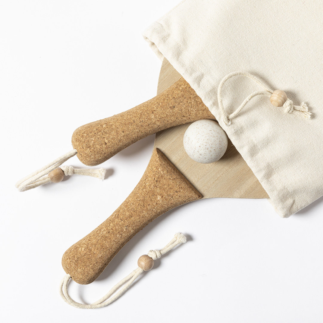 Para der Natur-Strandschaufeln. Aus Holz, mit verstärktem Naturkorkgriff und Handschlaufen mit Versteller. Präsentiert in einem natürlichen Baumwollbeutel mit Kordelzug und Weizenrohrkugel.