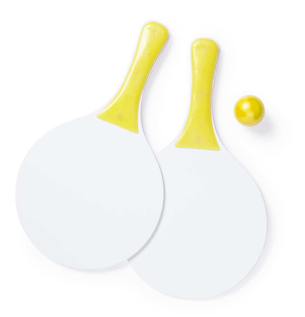 Beachball-Set mit zwei Schlägern aus Naturholz. Mit verstärkten Griffen in einer Vielzahl von lebendigen Farben. Präsentiert in einer Netztasche mit farblich passendem Ball.