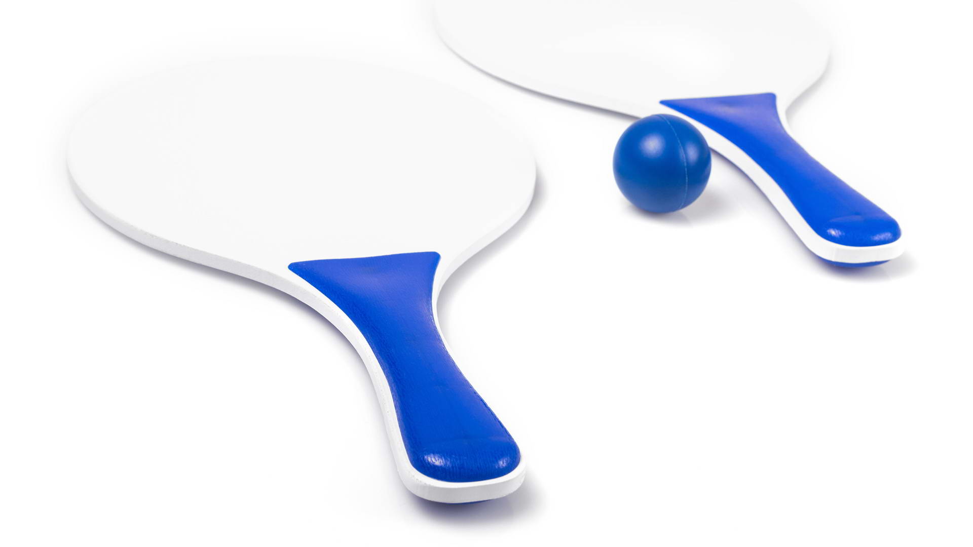 Beachball-Set mit zwei Schlägern aus Naturholz. Mit verstärkten Griffen in einer Vielzahl von lebendigen Farben. Präsentiert in einer Netztasche mit farblich passendem Ball.