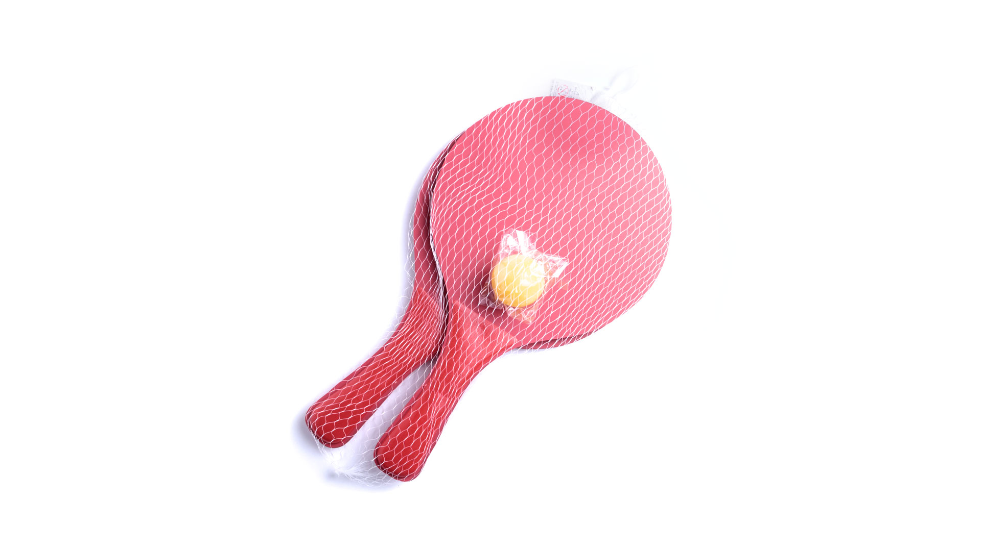 Hochwertiges Beachball-Set mit zwei Schlägern aus Naturholz in verschiedenen kräftigen Farben. Mit verstärktem Griff. Präsentiert in einer Netztasche mit Ball.