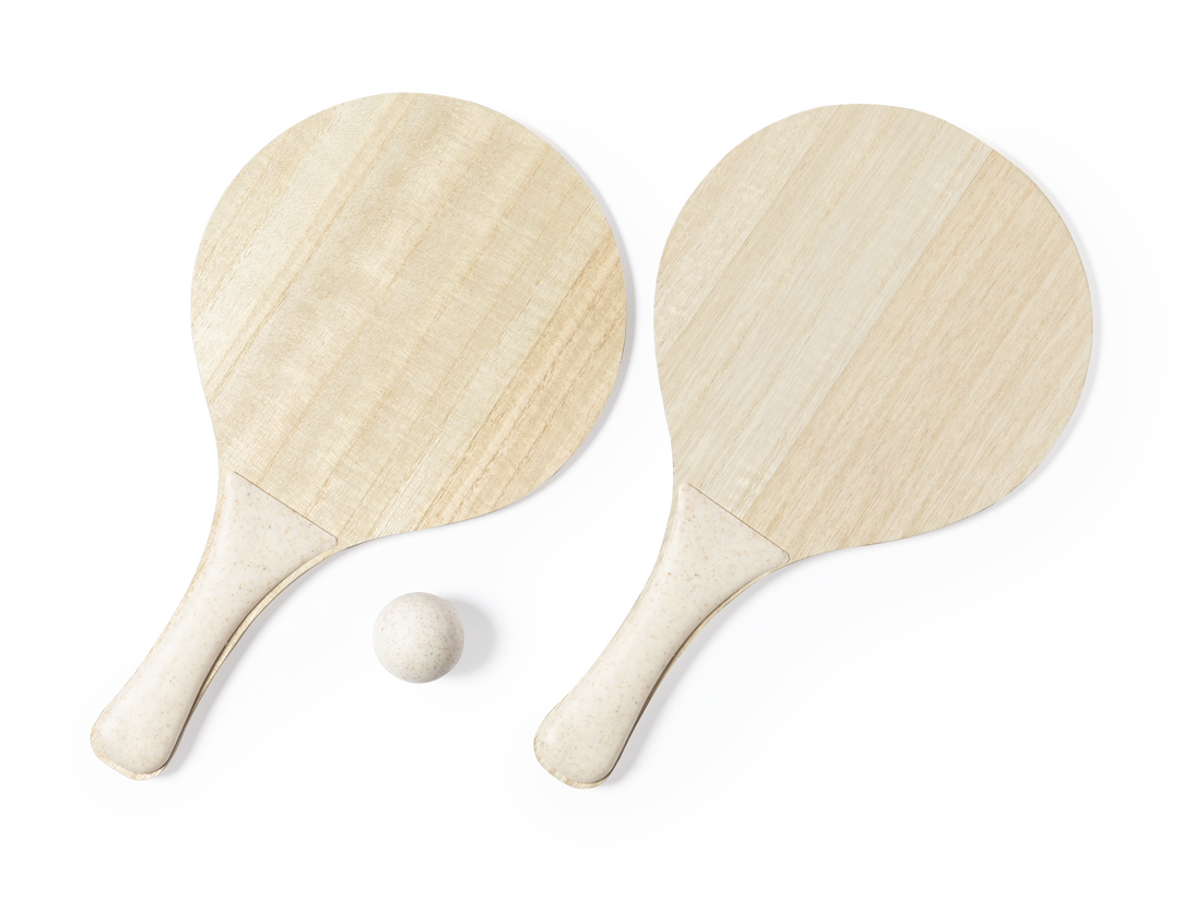 Paar Strandschläger mit integrierten Schach-, Dame- und Parcheesi-Brettern. Aus Holz, mit Griff aus Weizenstroh und Kugel ebenfalls aus Weizenstroh. Einschließlich Schachfiguren, Dame, Parcheesi-Figuren und Würfel. Das Set wird in einem individuellen Rucksack aus Baumwolle mit passenden Verschlussbändern präsentiert. Weizenstroh fördert die Verwendung natürlicher Rohstoffe und reduziert den Schadstoffausstoß.