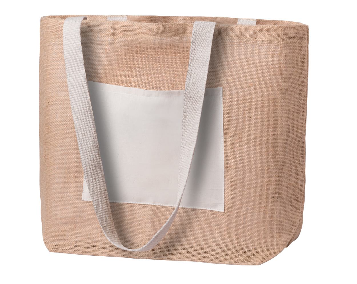 Jute-Strandtasche mit farbig abgestimmten Henkeln und Seitentasche.