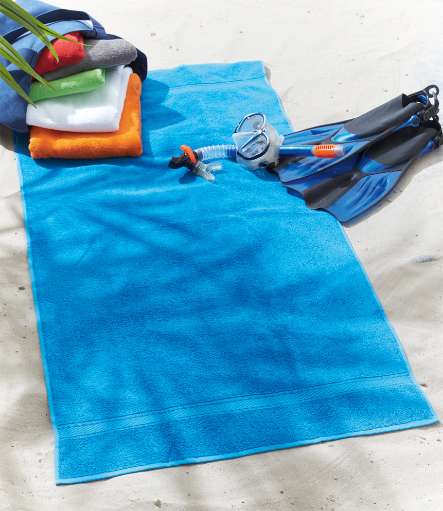 Strandhandtuch SUMMER TRIP: saugstark, mit weicher Oberflächenstruktur, Bordüre oben und unten, mit OEKO-TEX®-Zertifikat, inkl. Label zum Bedrucken, 375 g / m²