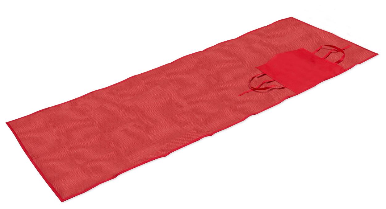 Geflochtene Strandmatte aus Kunststoff mit Tragegriffen.