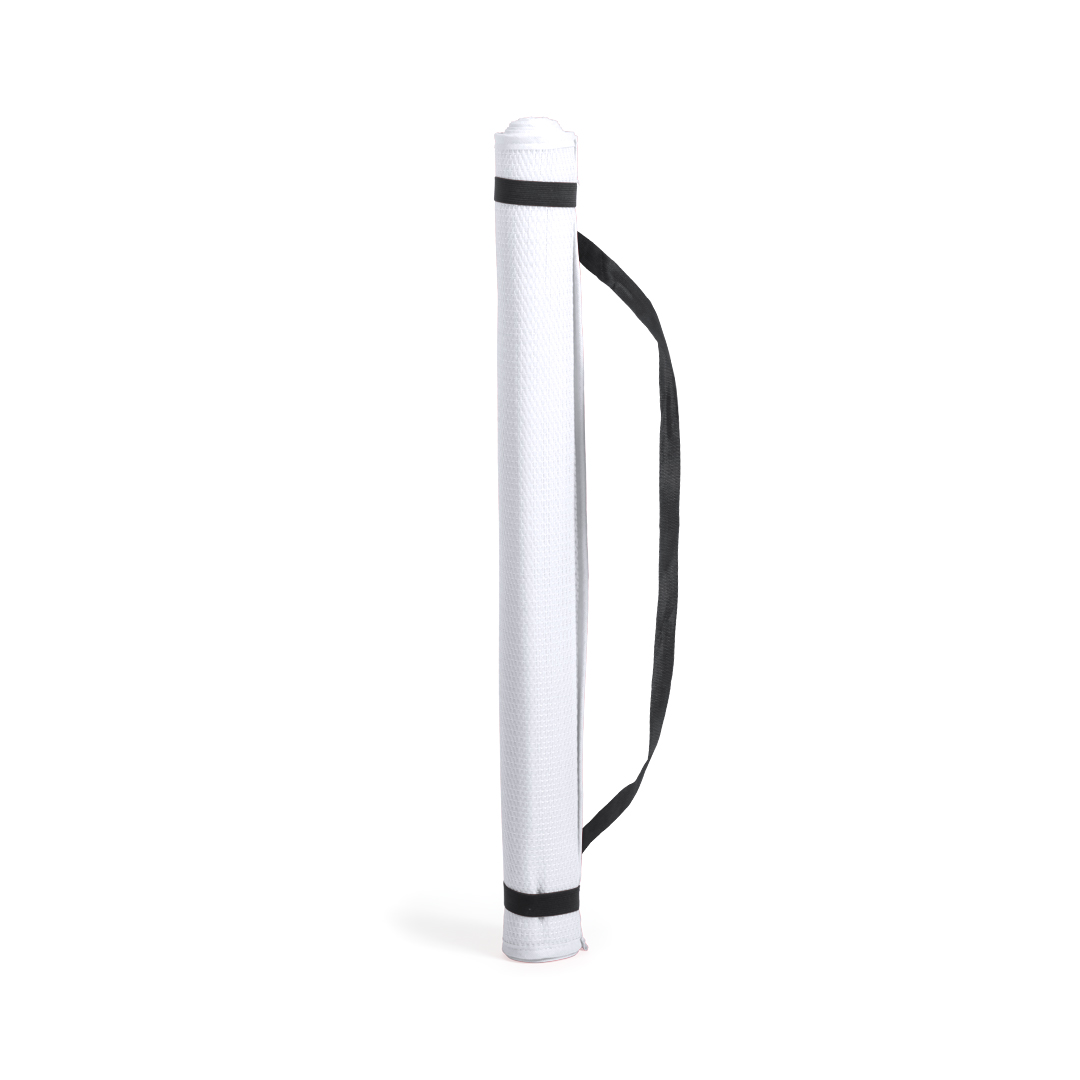 Maxi-Strandmatte mit den Maßen 180 x 60 cm aus hochresistentem geflochtenem Polypropylen (PP). In verschiedenen lebendigen Farben und glänzender Ausführung. Mit Gummibändern zum Fixieren im aufgerollten Zustand und Schultergurt.