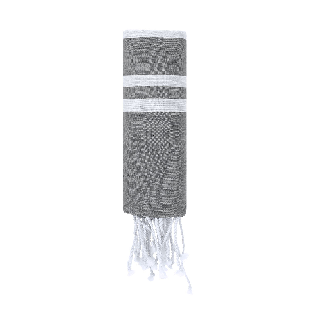 Weicher Pareo-Handtuch von 150 g / m2 in einer Kombination aus Baumwolle und Polyester. Sein Design hat einen bunten Hintergrund mit weißen Streifen. Enthält Fransen an den Enden, die ein dekoratives Detail hinzufügen und den Abschluss vervollständigen.