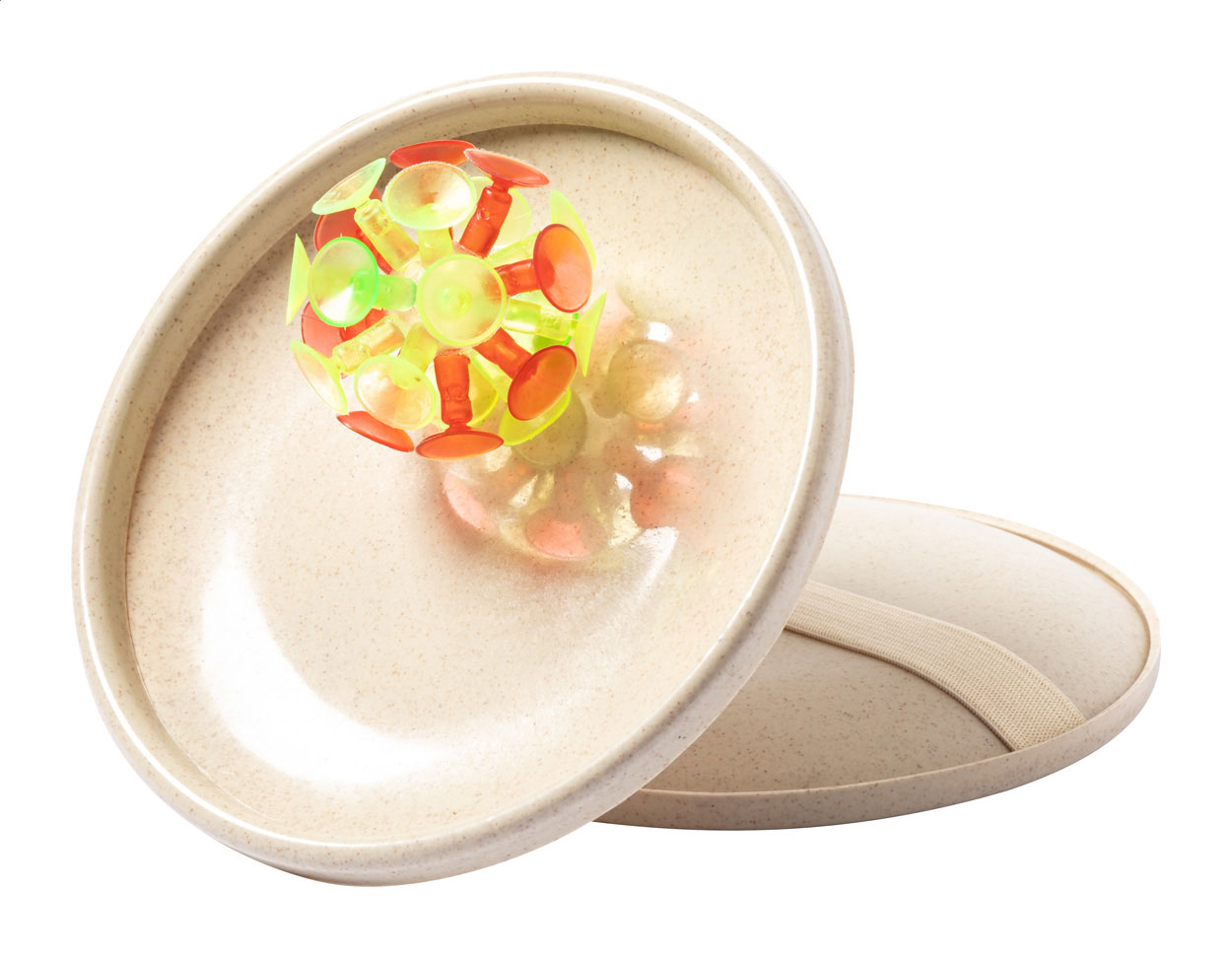 Strandspiel, bestehend aus Bällen mit Saugnäpfen und flachen Paddelscheiben aus Weizenstroh mit elastischem Band.
