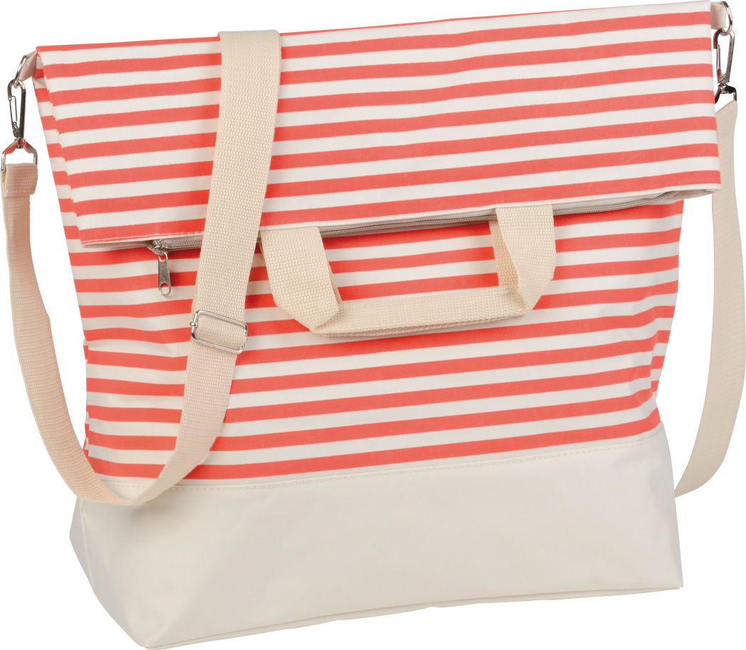 Strandtasche JUIST: geräumiges Reißverschluss-Hauptfach, 2 bequeme Tragegriffe, verstell- und abnehmbarer Schultergurt, durch Umklappen des Oberteils und Magnetverschluss kann das Volumen der Tasche auf innovative Art um ca. 25 % verkleinert werden
