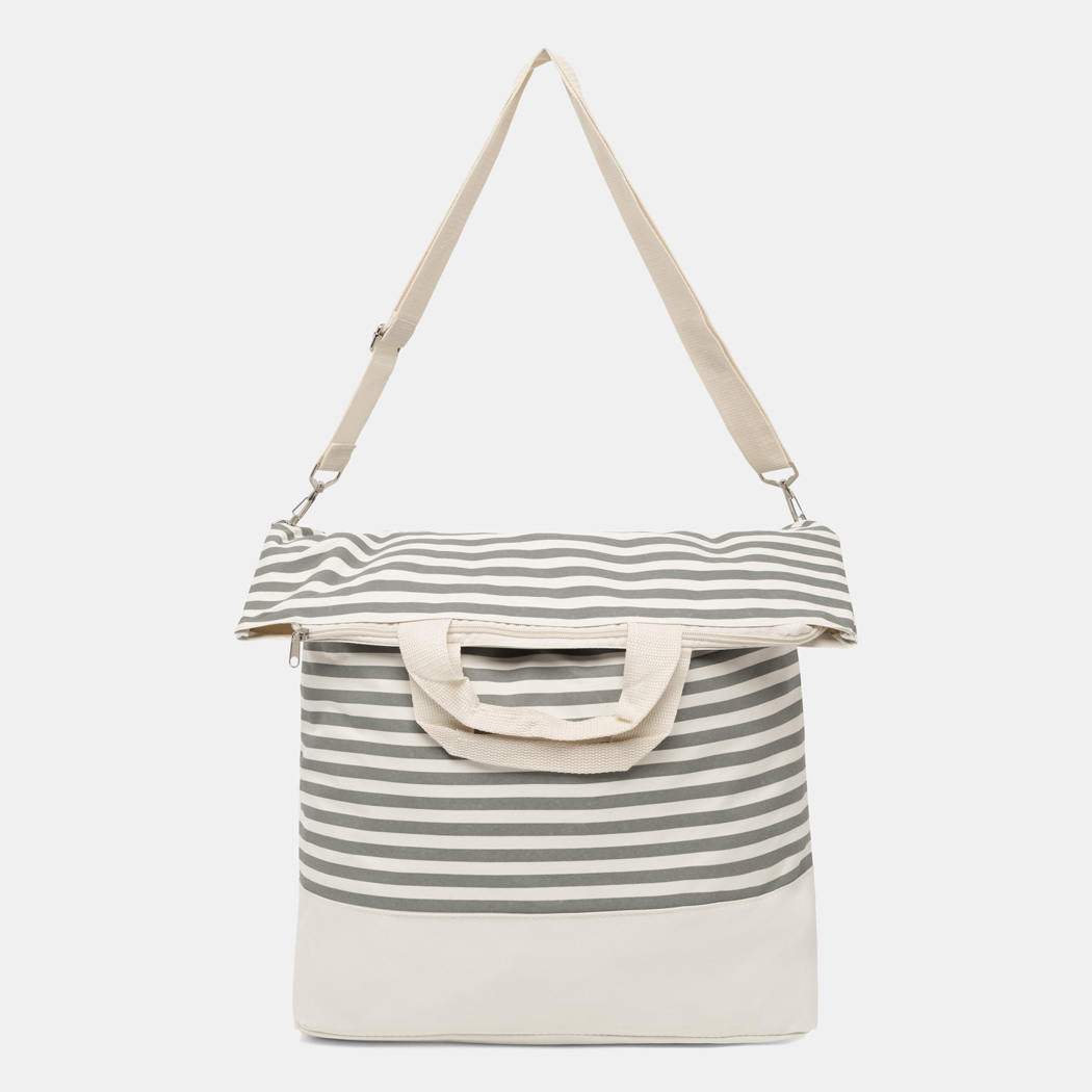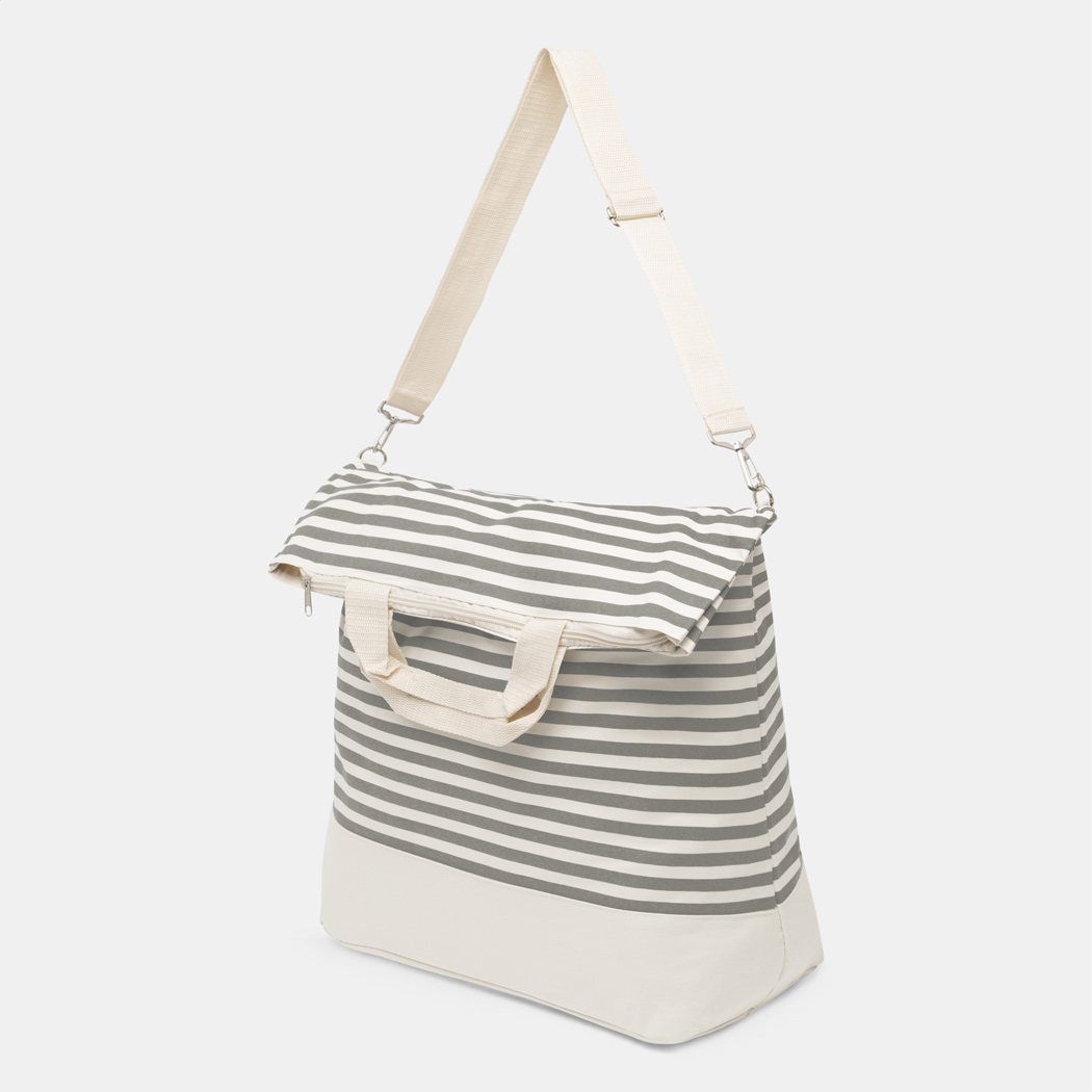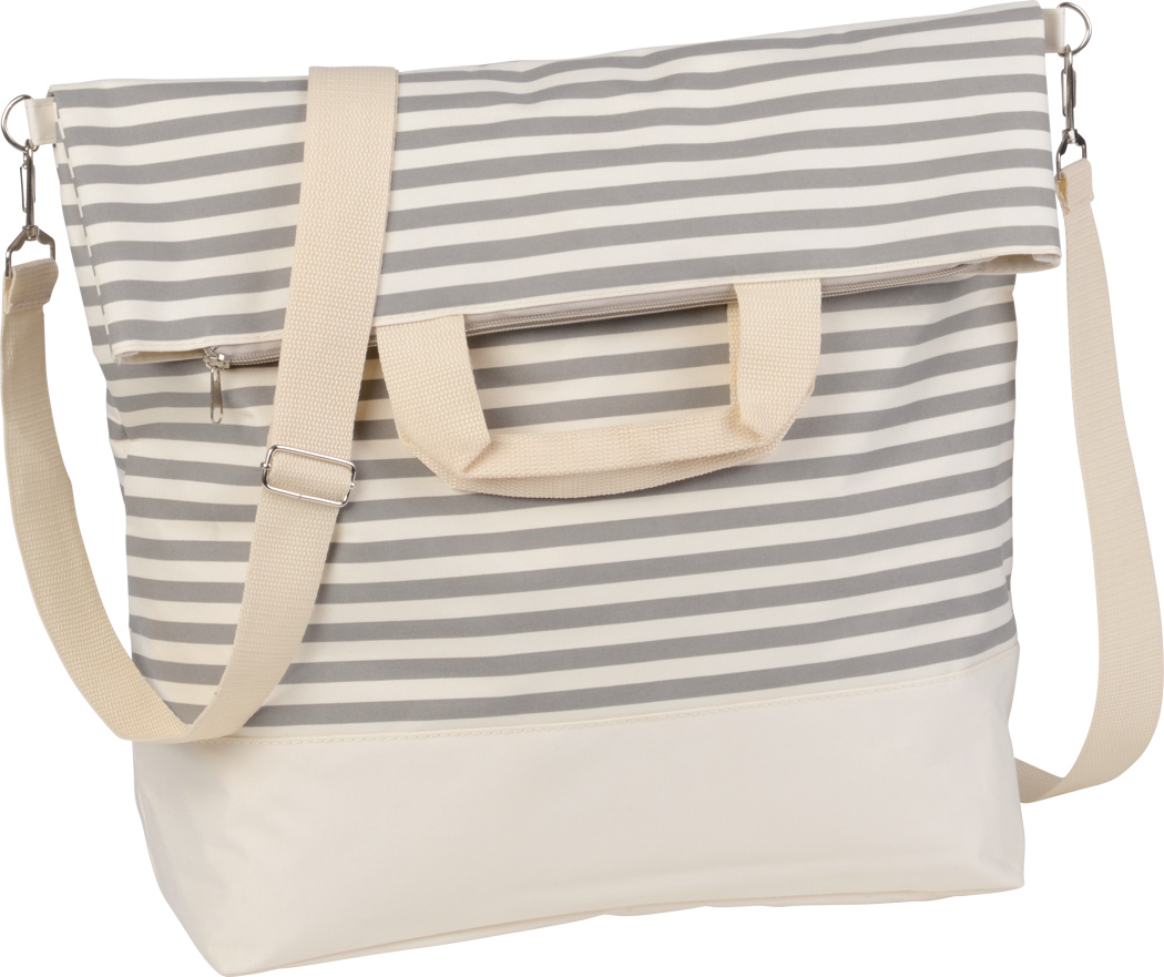 Strandtasche JUIST: geräumiges Reißverschluss-Hauptfach, 2 bequeme Tragegriffe, verstell- und abnehmbarer Schultergurt, durch Umklappen des Oberteils und Magnetverschluss kann das Volumen der Tasche auf innovative Art um ca. 25 % verkleinert werden