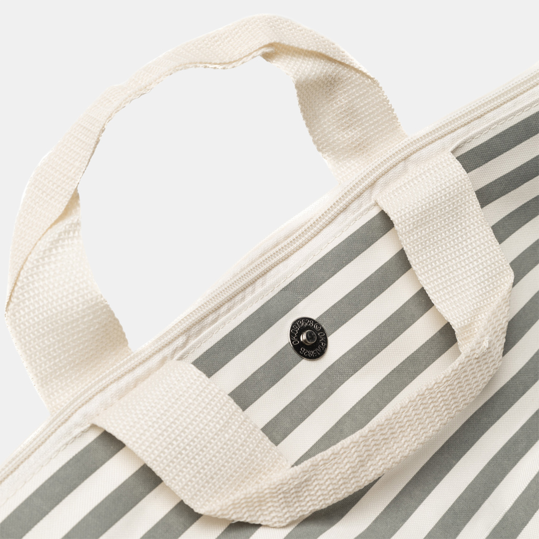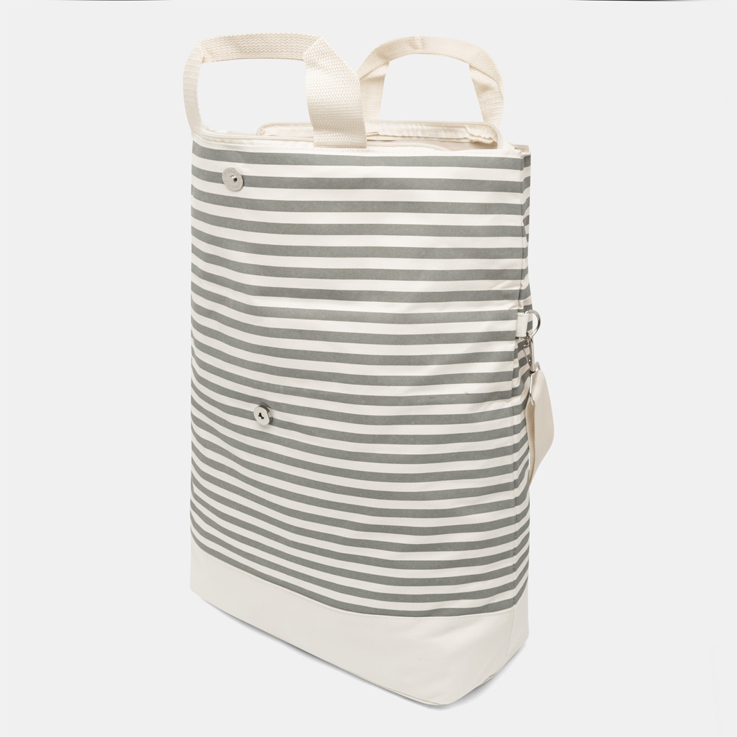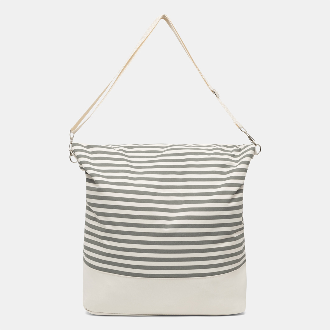 Strandtasche JUIST: geräumiges Reißverschluss-Hauptfach, 2 bequeme Tragegriffe, verstell- und abnehmbarer Schultergurt, durch Umklappen des Oberteils und Magnetverschluss kann das Volumen der Tasche auf innovative Art um ca. 25 % verkleinert werden