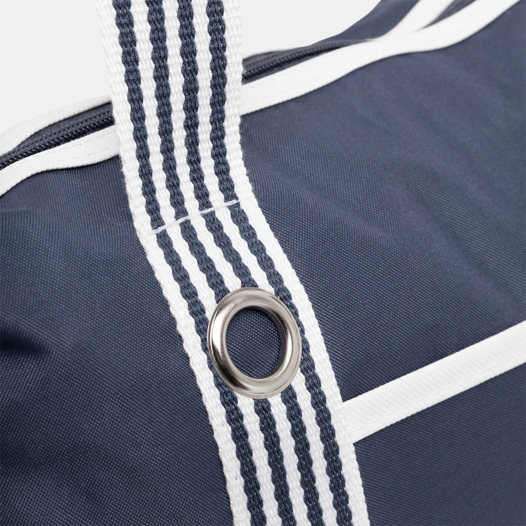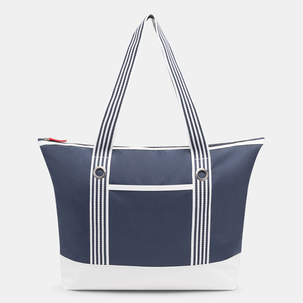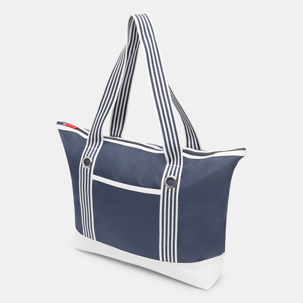 Strandtasche MARLENE: Reißverschluss-Hauptfach, extra Reißverschluss-Tasche innen, Einsteckfach auf der Front, gestreifte Schultergurte mit dekorativer Metallöse, schmutzabweisender Boden