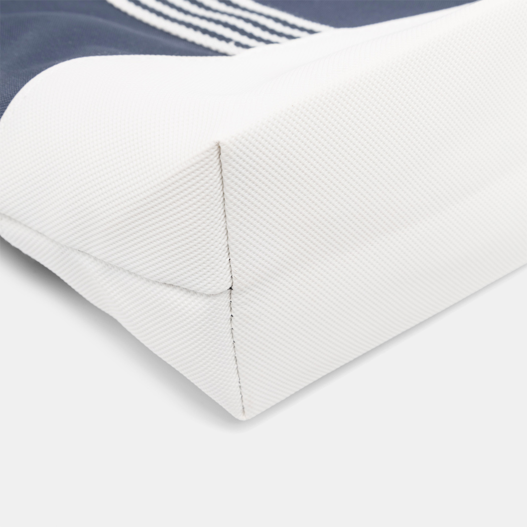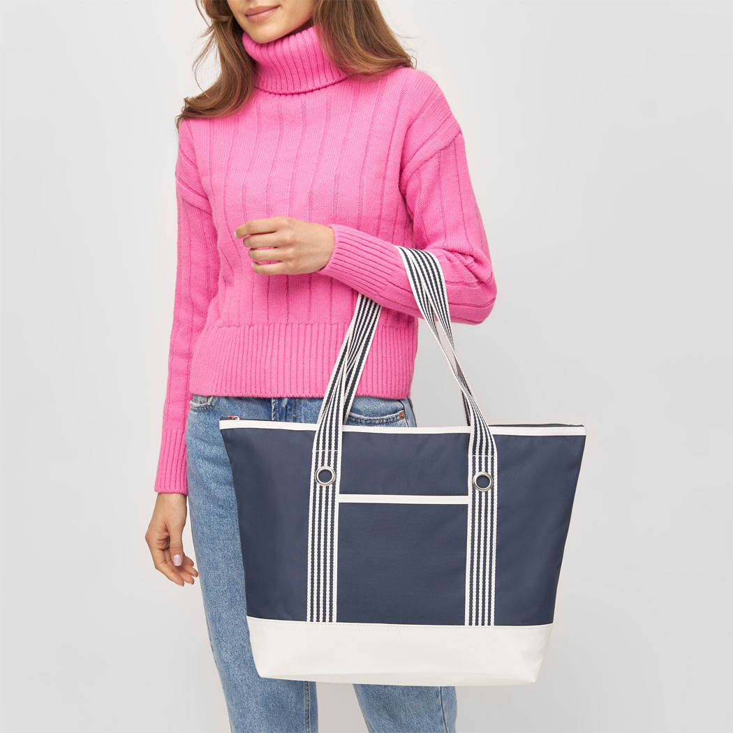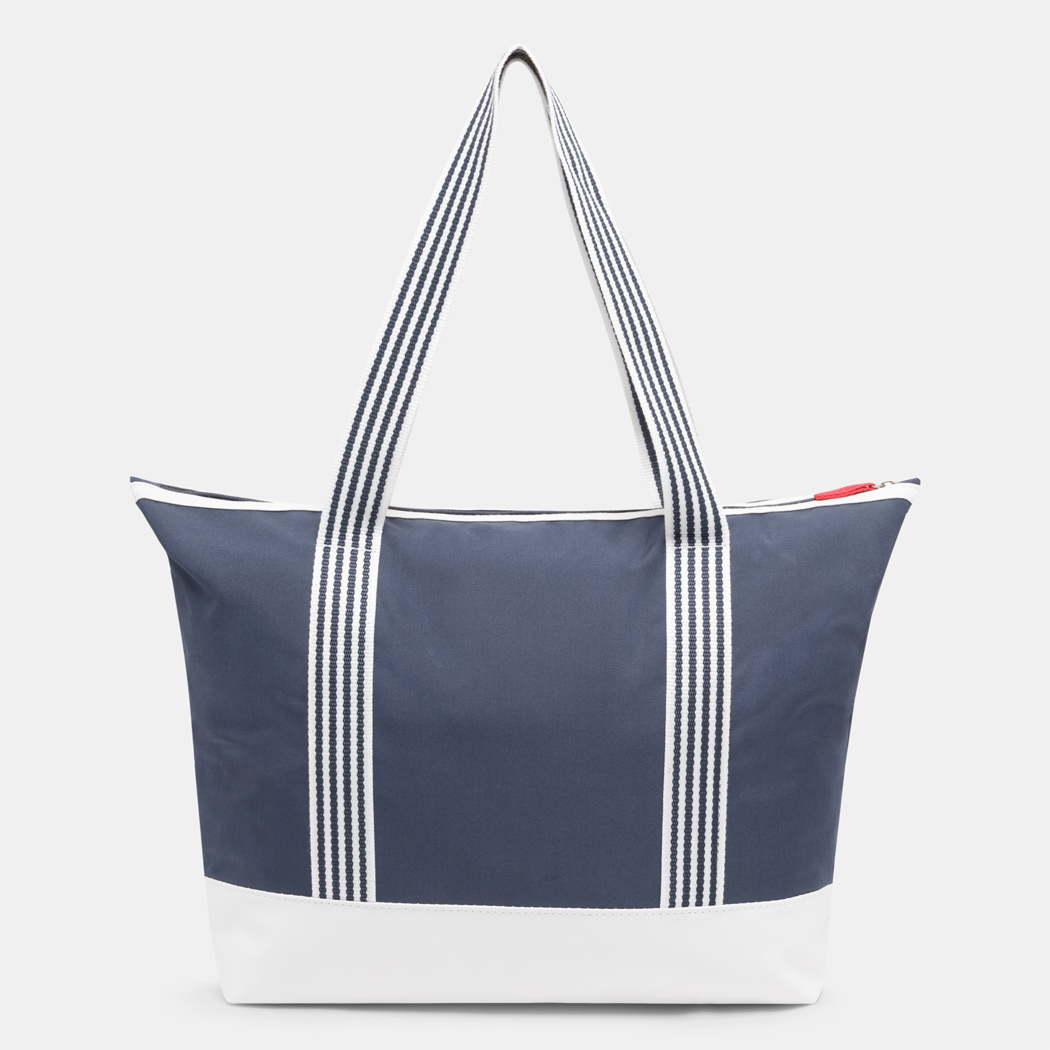Strandtasche MARLENE: Reißverschluss-Hauptfach, extra Reißverschluss-Tasche innen, Einsteckfach auf der Front, gestreifte Schultergurte mit dekorativer Metallöse, schmutzabweisender Boden
