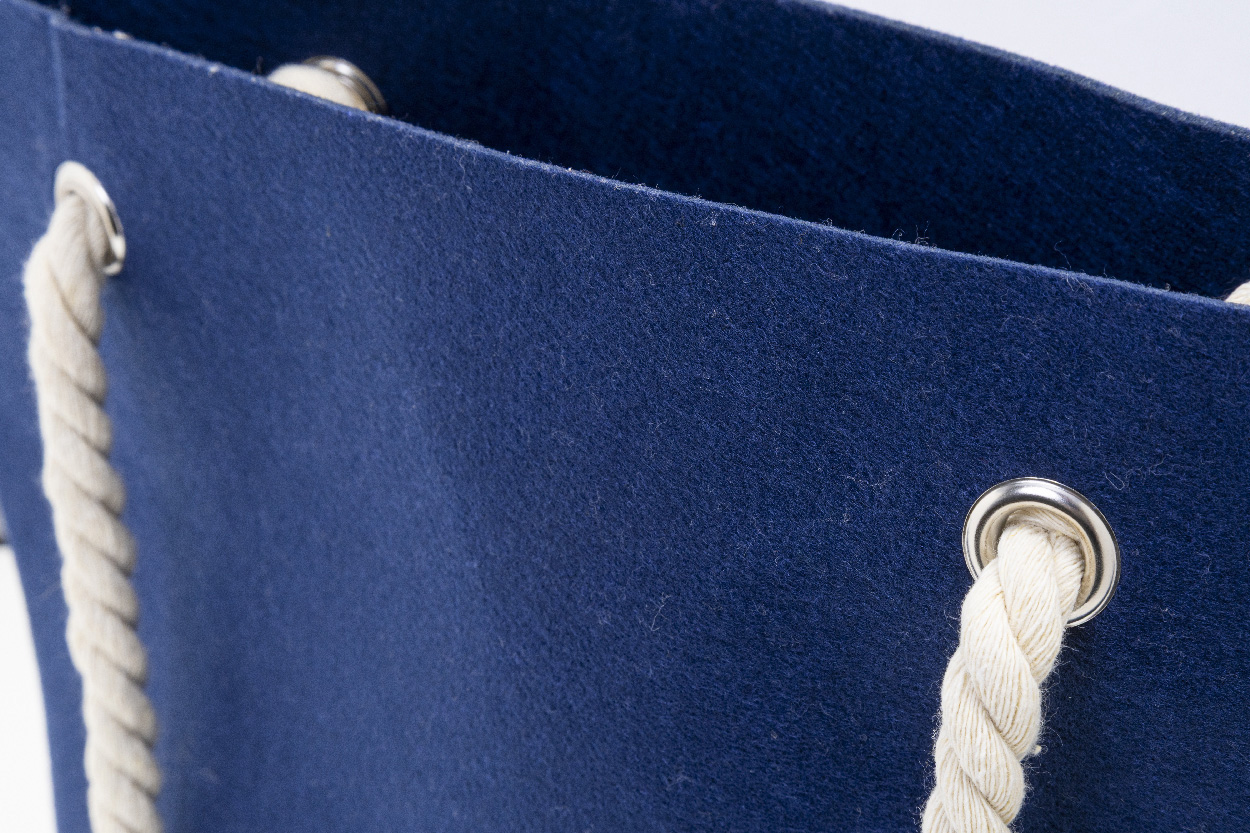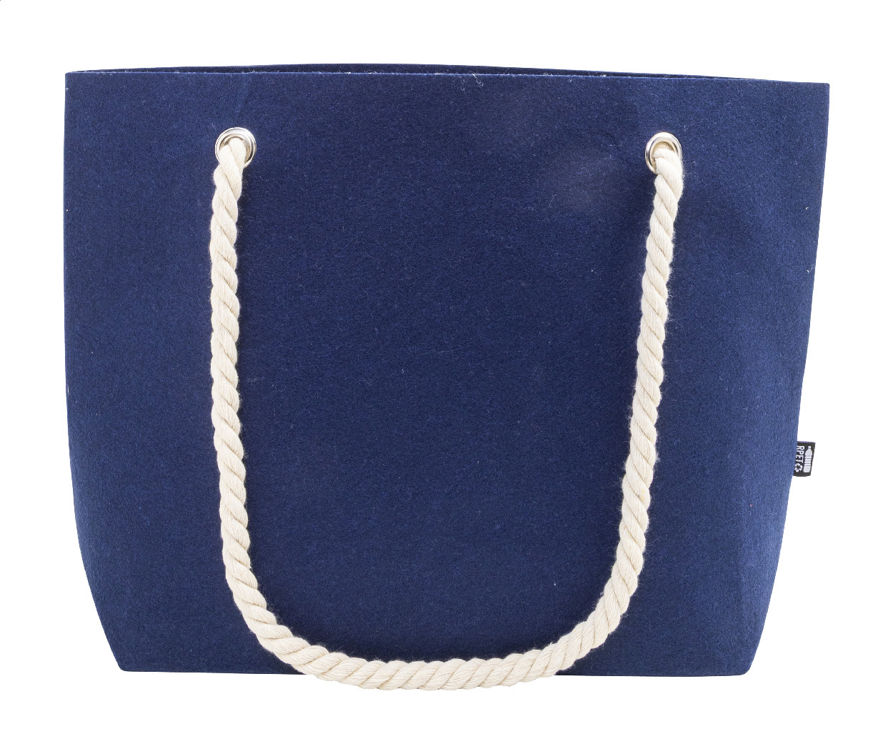 Strand- oder Einkaufstasche aus RPET-Filz mit Baumwollkordelgriffen und Bodenfalte. Mit RPET-Label.