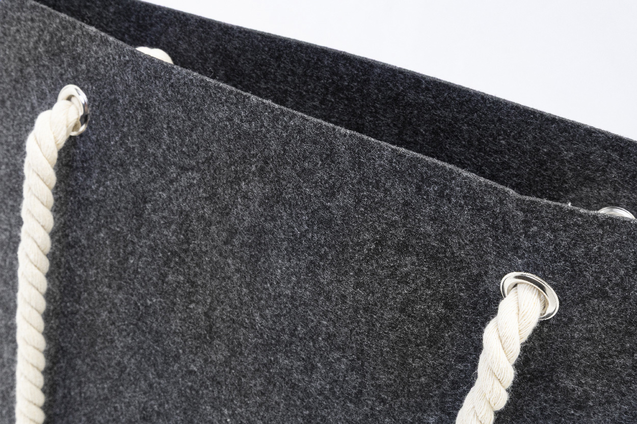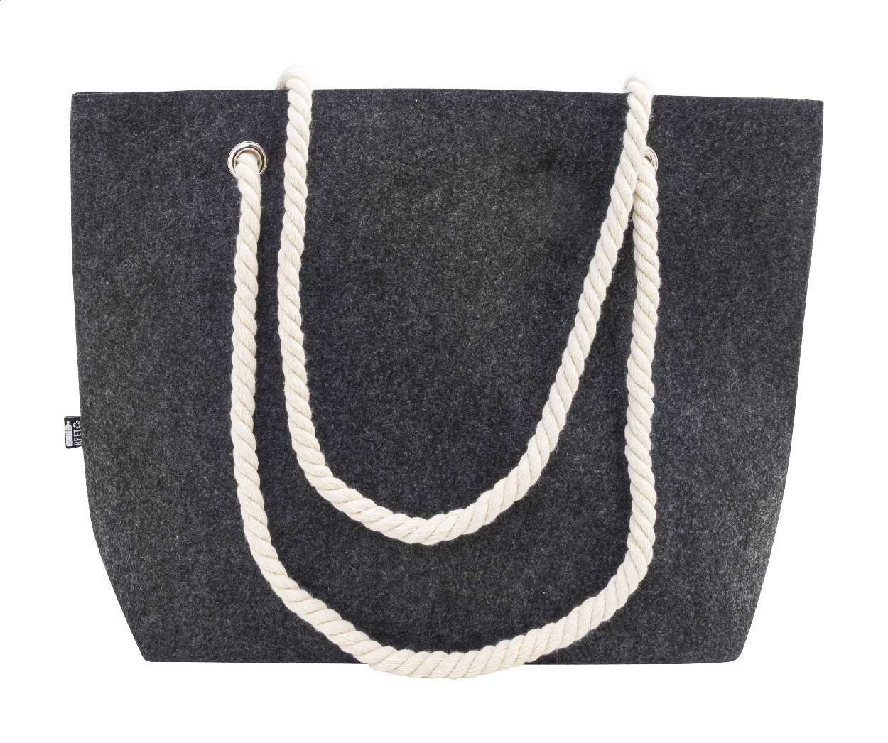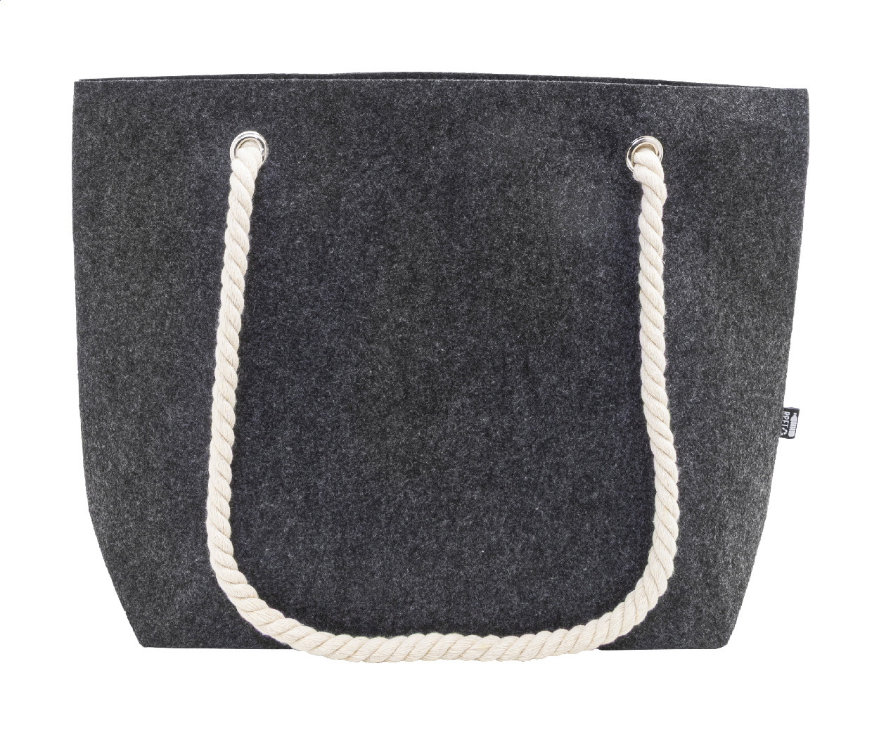 Strand- oder Einkaufstasche aus RPET-Filz mit Baumwollkordelgriffen und Bodenfalte. Mit RPET-Label.
