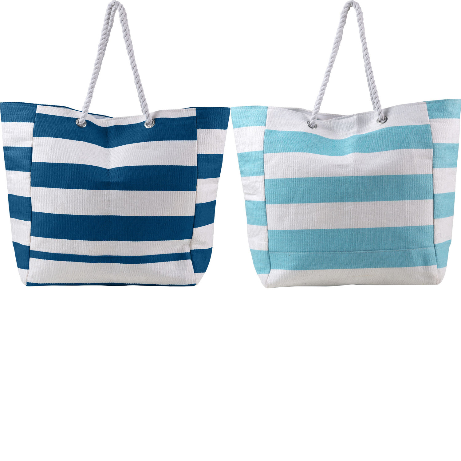 Strandtasche aus Polyester, gestreift, mit langen Tragegriffen aus Baumwolle und Magnetverschluss.