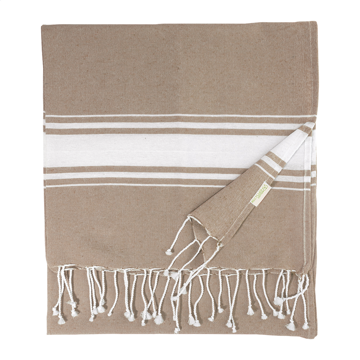Zweifarbiges Pareo-Strandtuch. Material: 70 % recycelter Baumwolle und 30 % RPET-Polyester (180 g / m²).