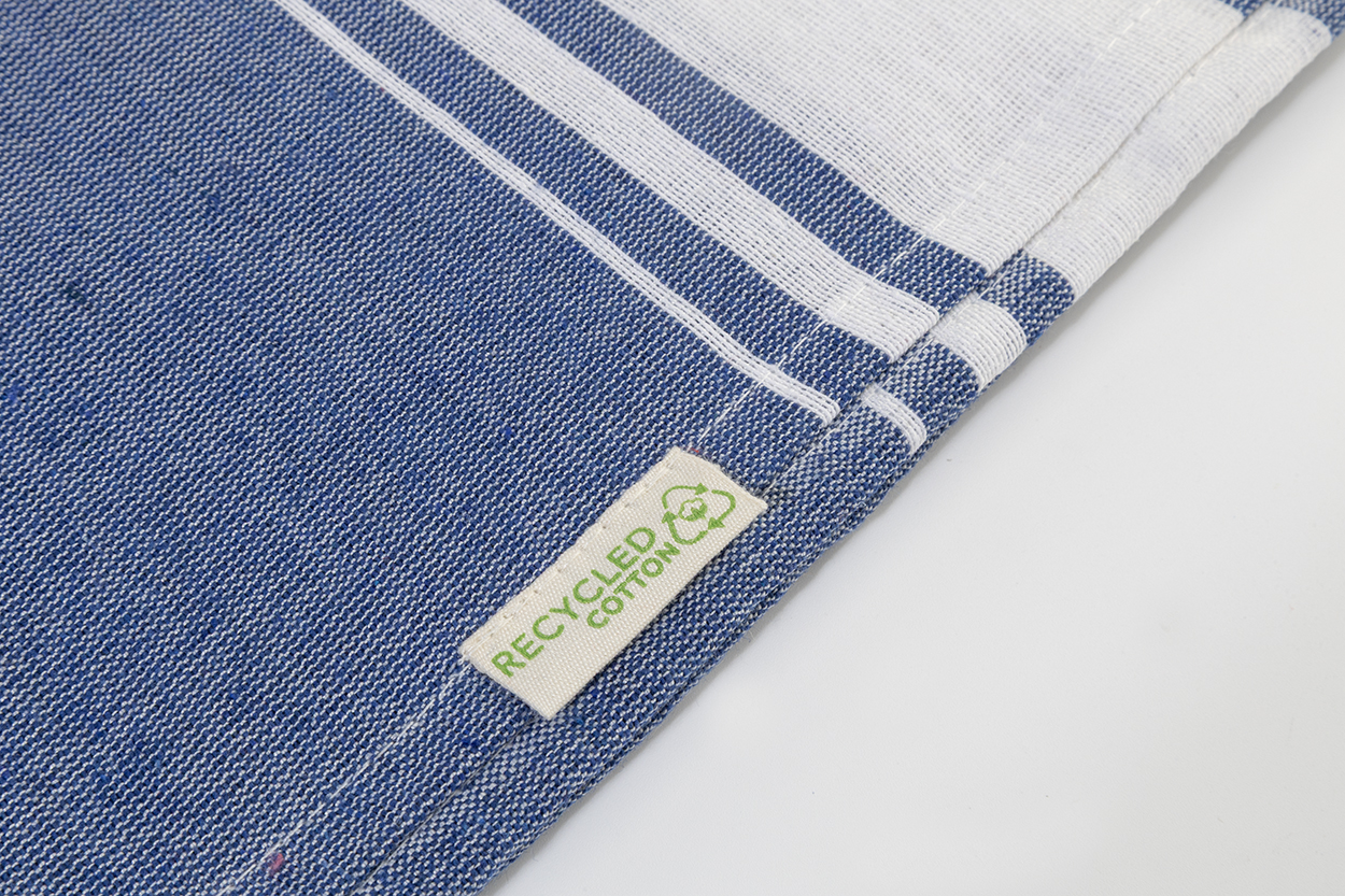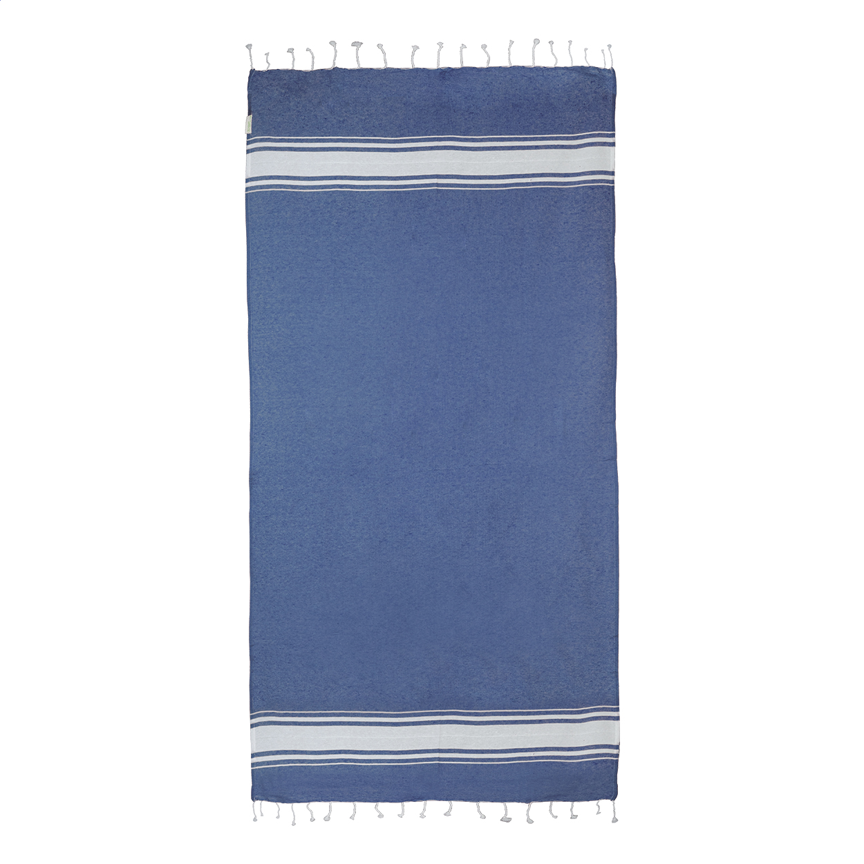 Zweifarbiges Pareo-Strandtuch. Material: 70 % recycelter Baumwolle und 30 % RPET-Polyester (180 g / m²).