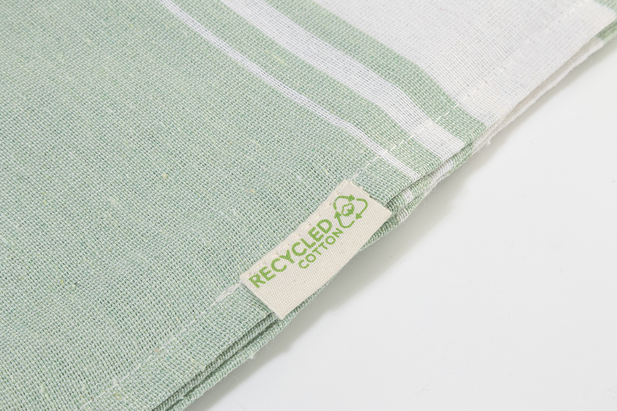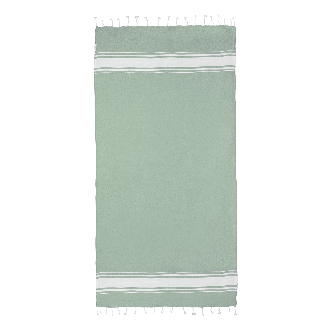 Zweifarbiges Pareo-Strandtuch. Material: 70 % recycelter Baumwolle und 30 % RPET-Polyester (180 g / m²).