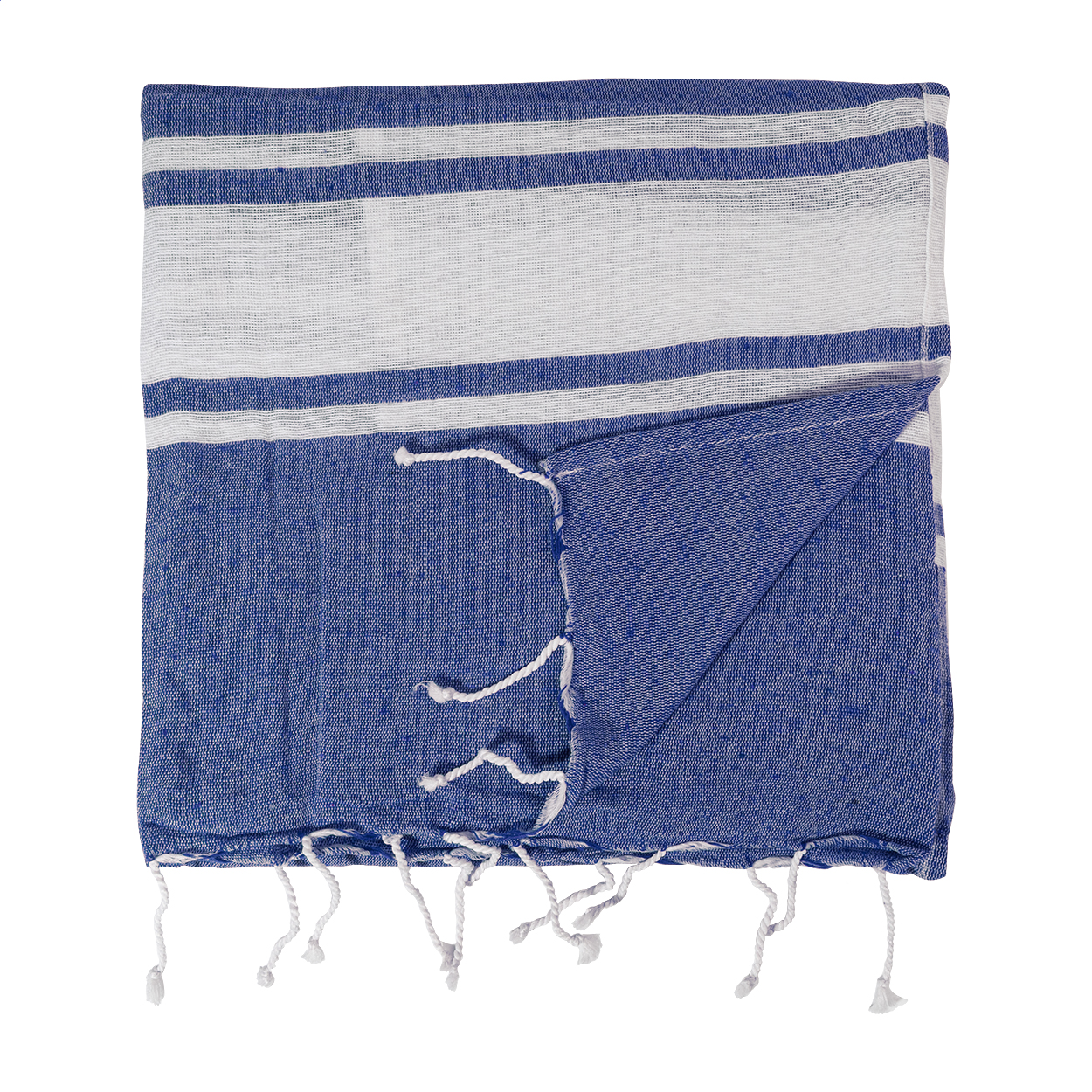 Zweifarbiges Pareo-Strandtuch mit integriertem Beutel mit Kordelzug. Material: 70 % recycelte Baumwolle und 30 % RPET-Polyester (180 g / m²).