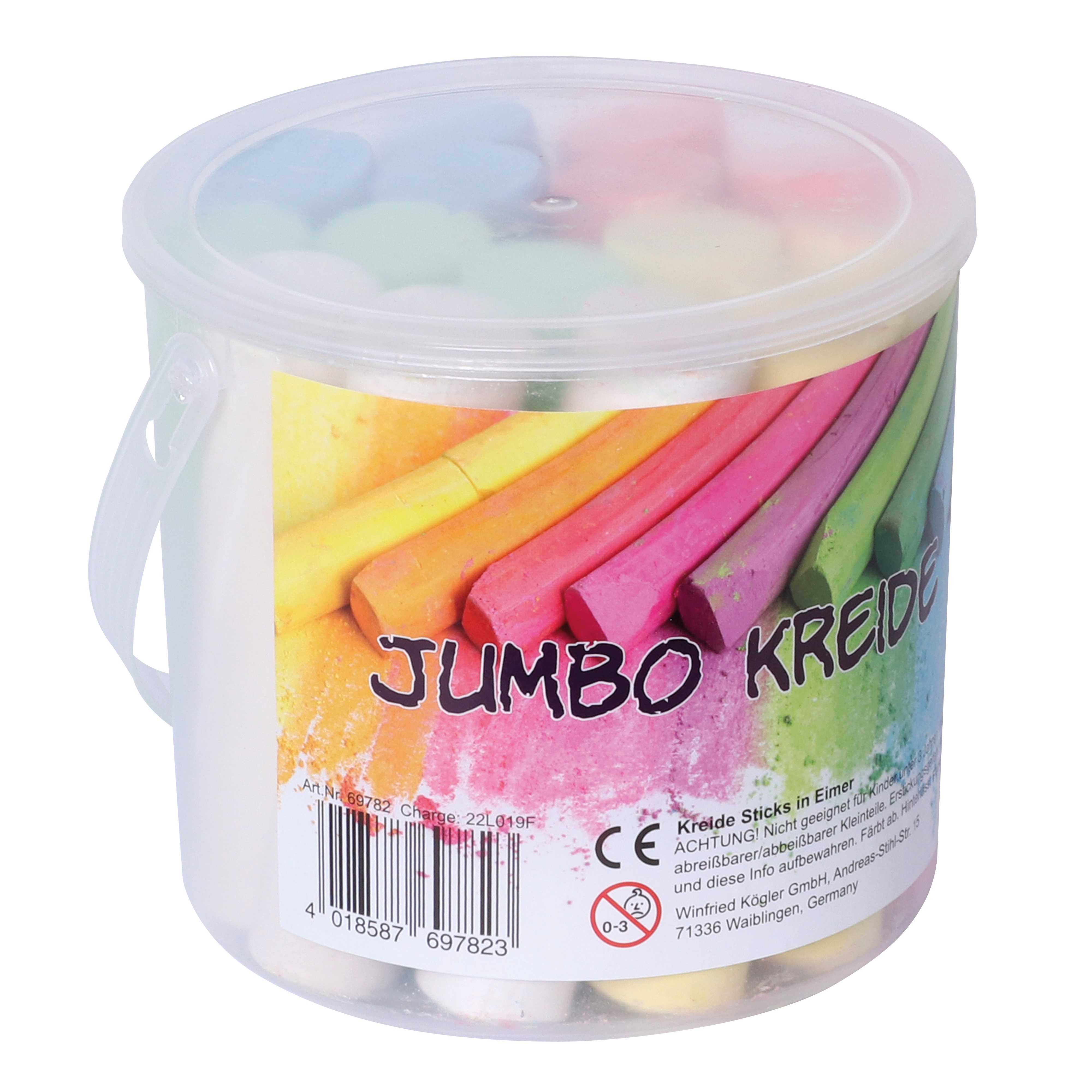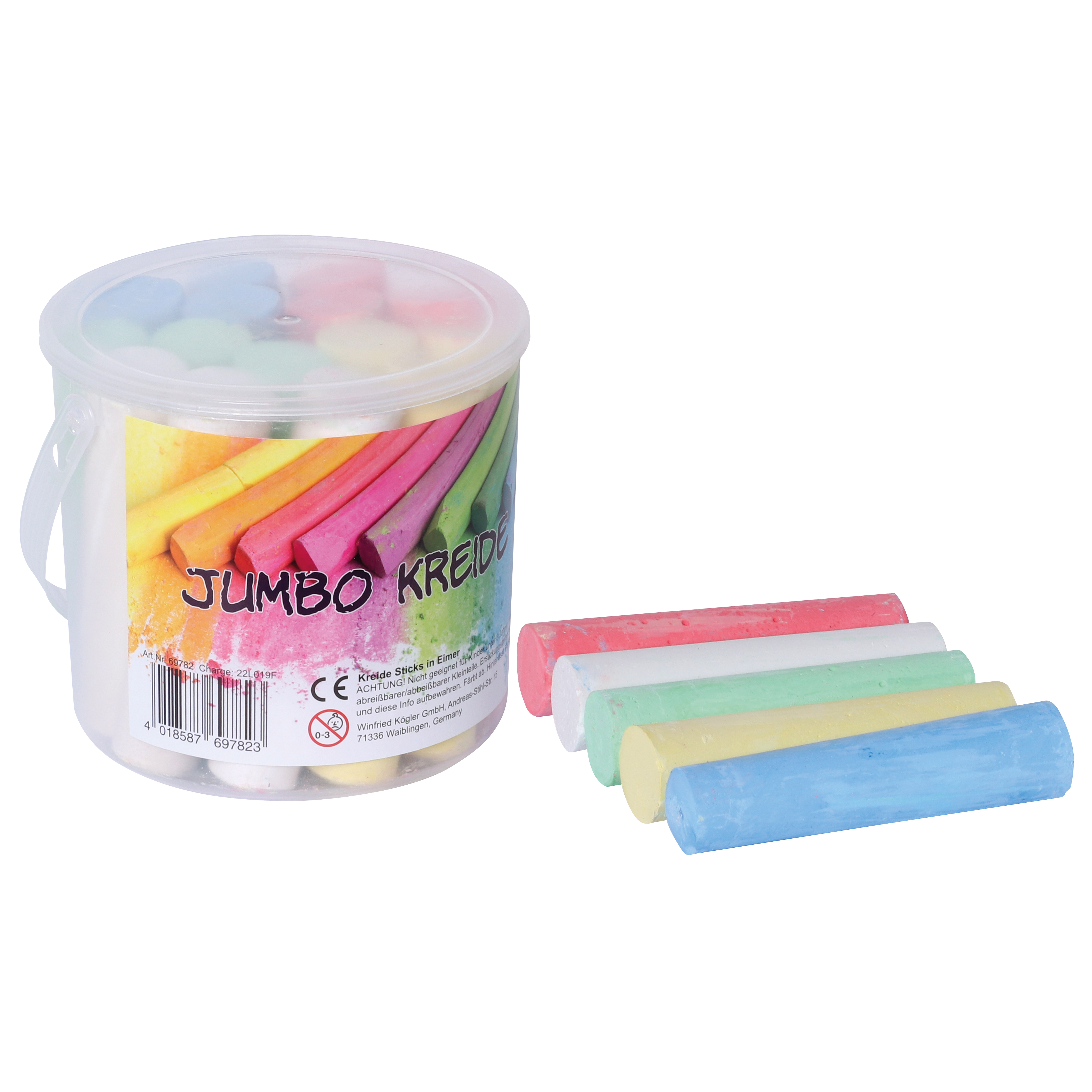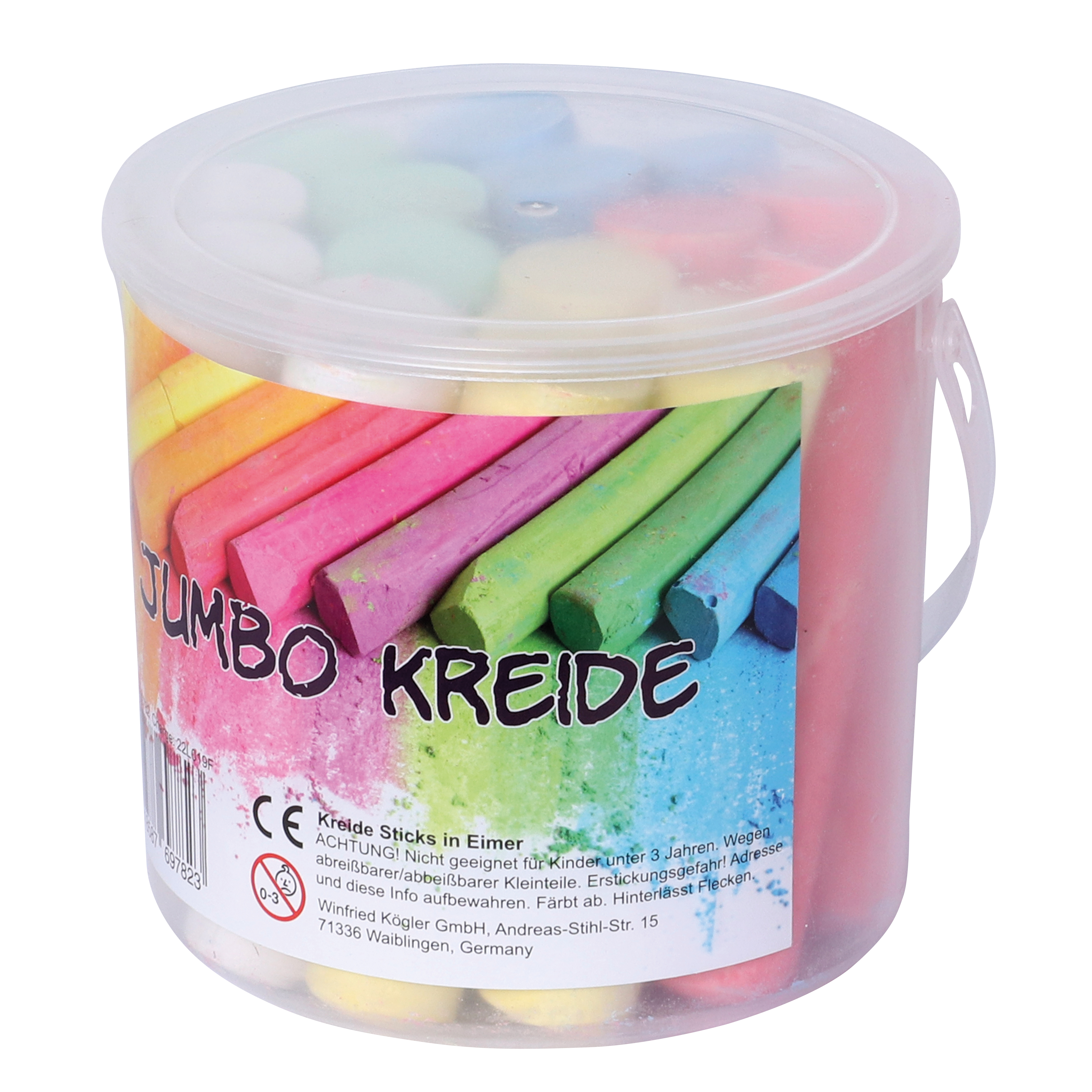 Große Kreiden für kleine Straßenmalkünstler! 15 extra große Kreiden im 5 verschiedenen Farben (grün, rot, weiß, blau, gelb) verpackt in einem praktischen Eimer. Für jede Menge Mal-Spaß auf Tafeln, Asphalt und Pflastersteinen!