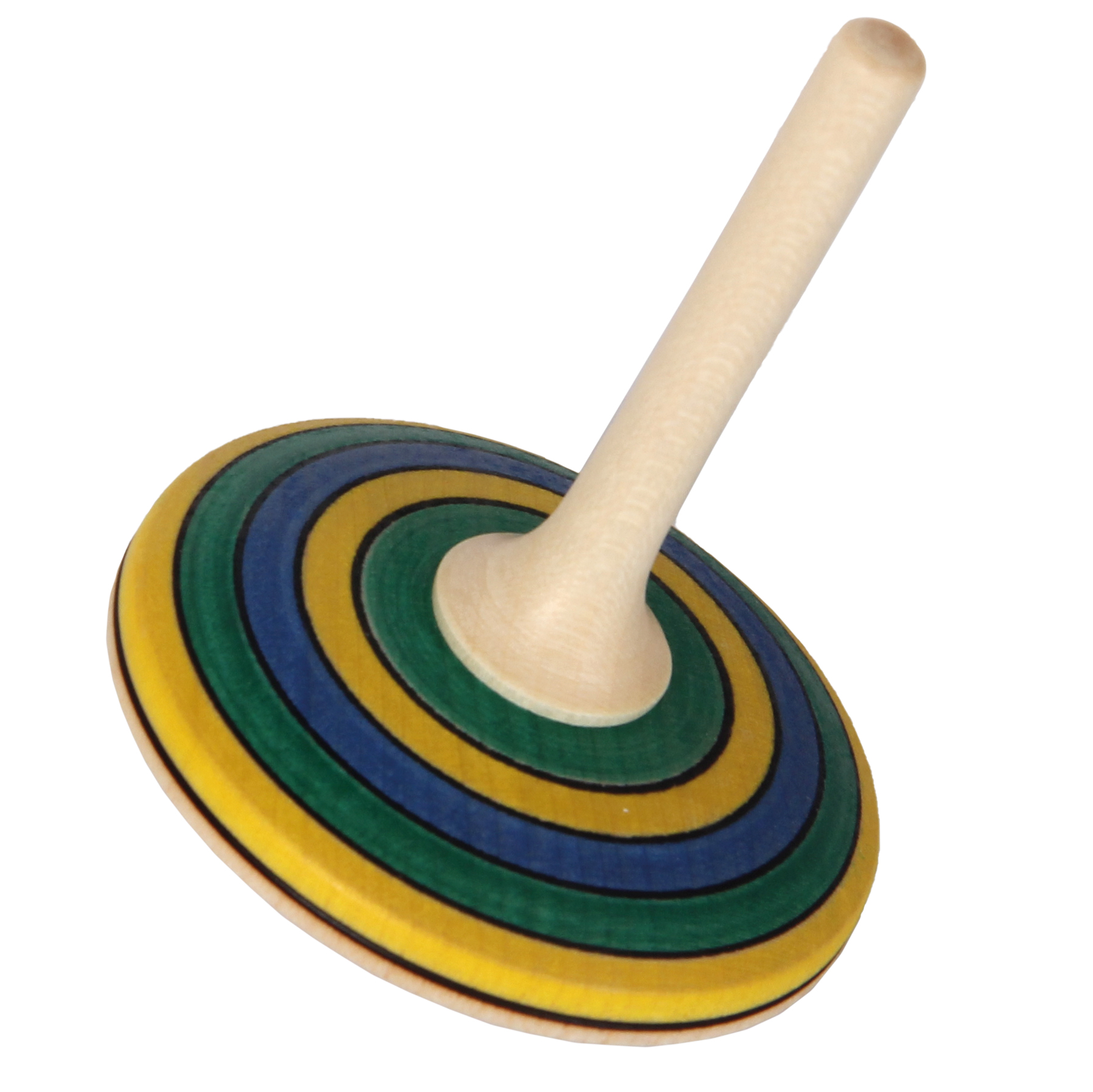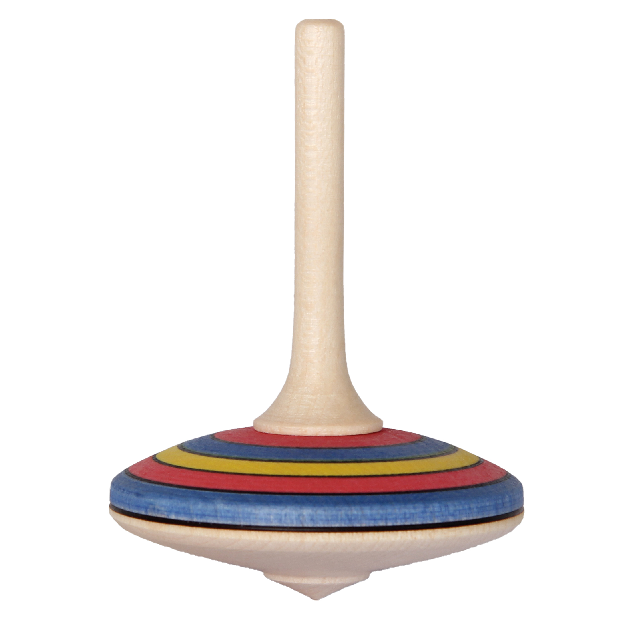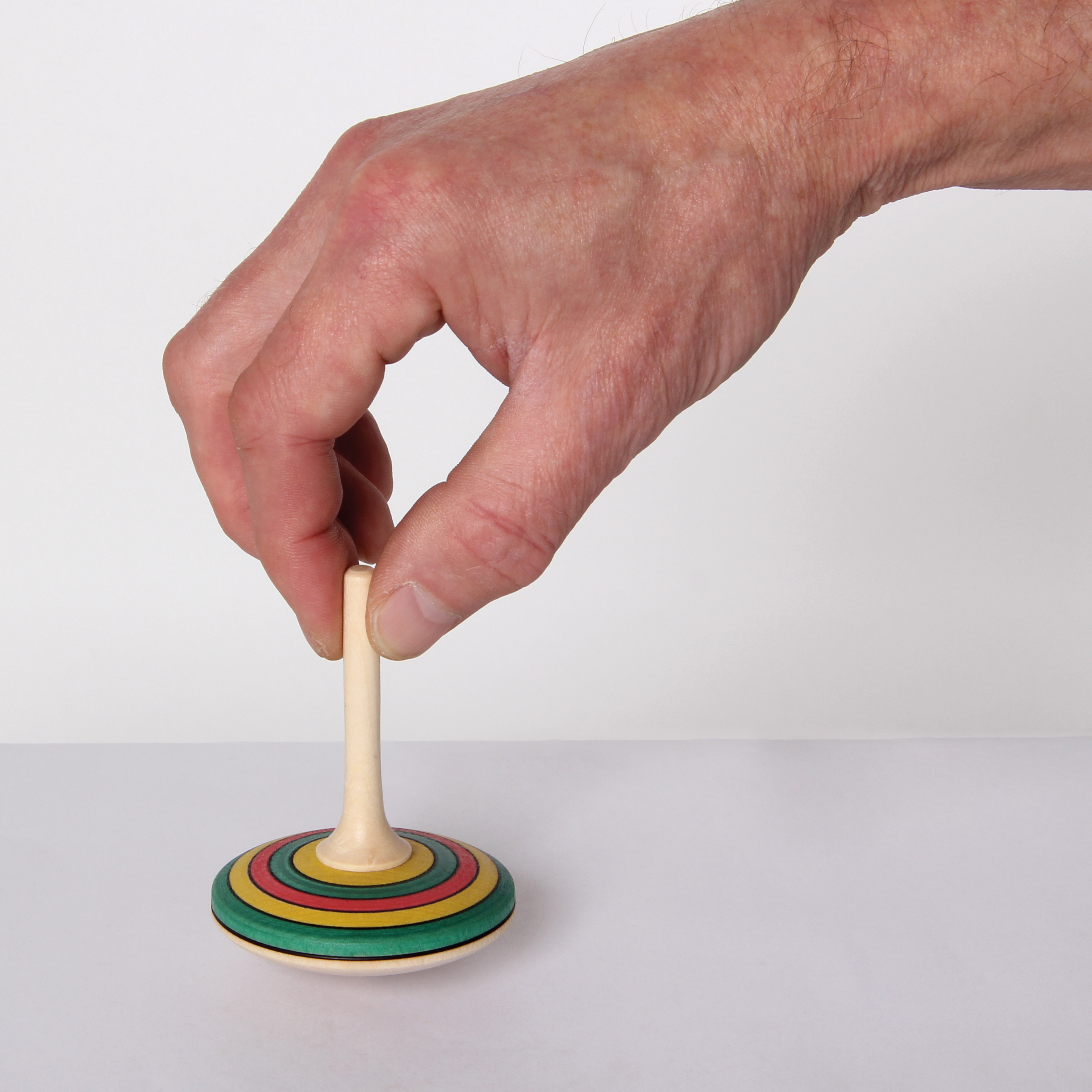 Durch den langen Stiel als Finger- oder Zweihandkreisel zu benutzen. Gefertigt aus Ahornholz und in 4 Farbdesigns bemalt.