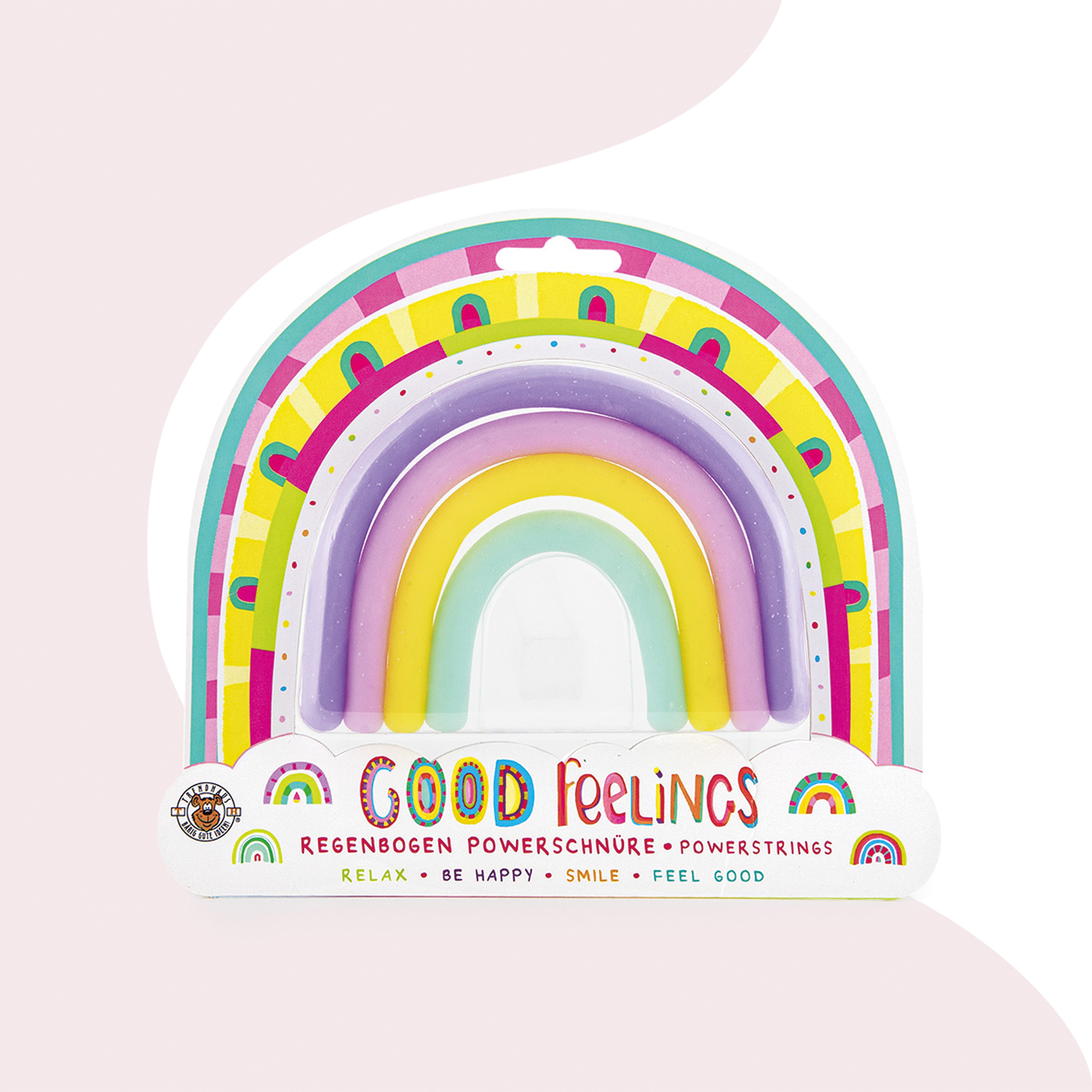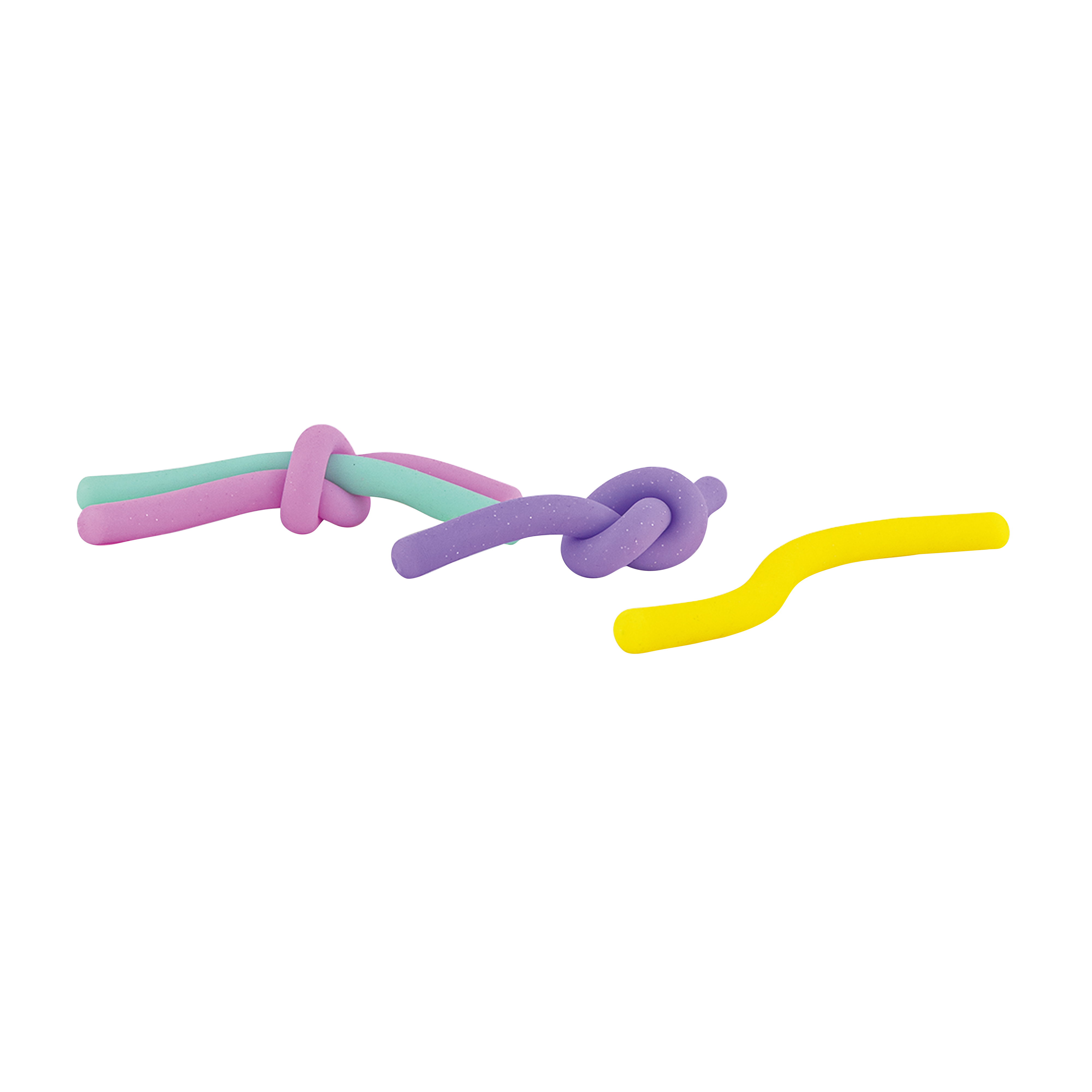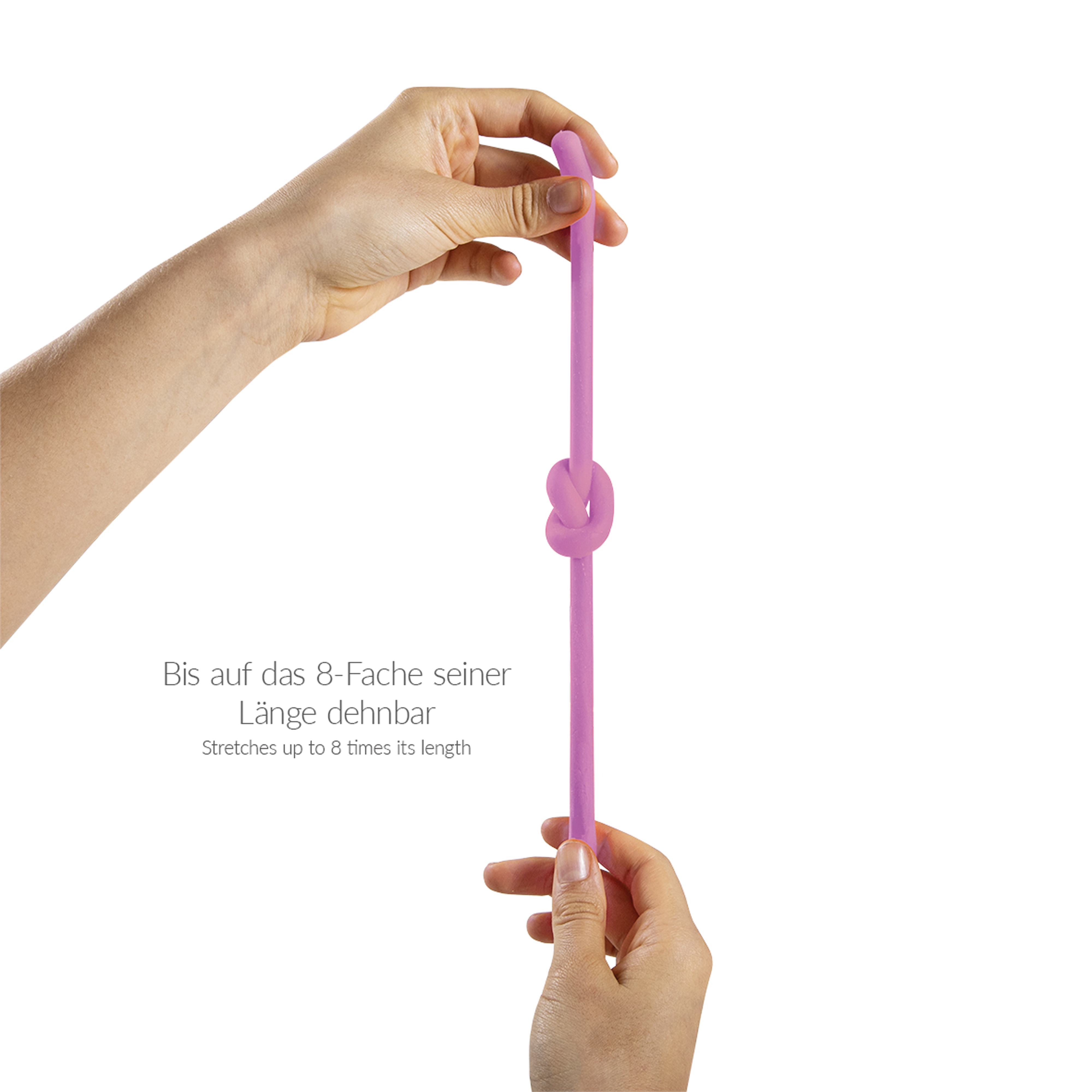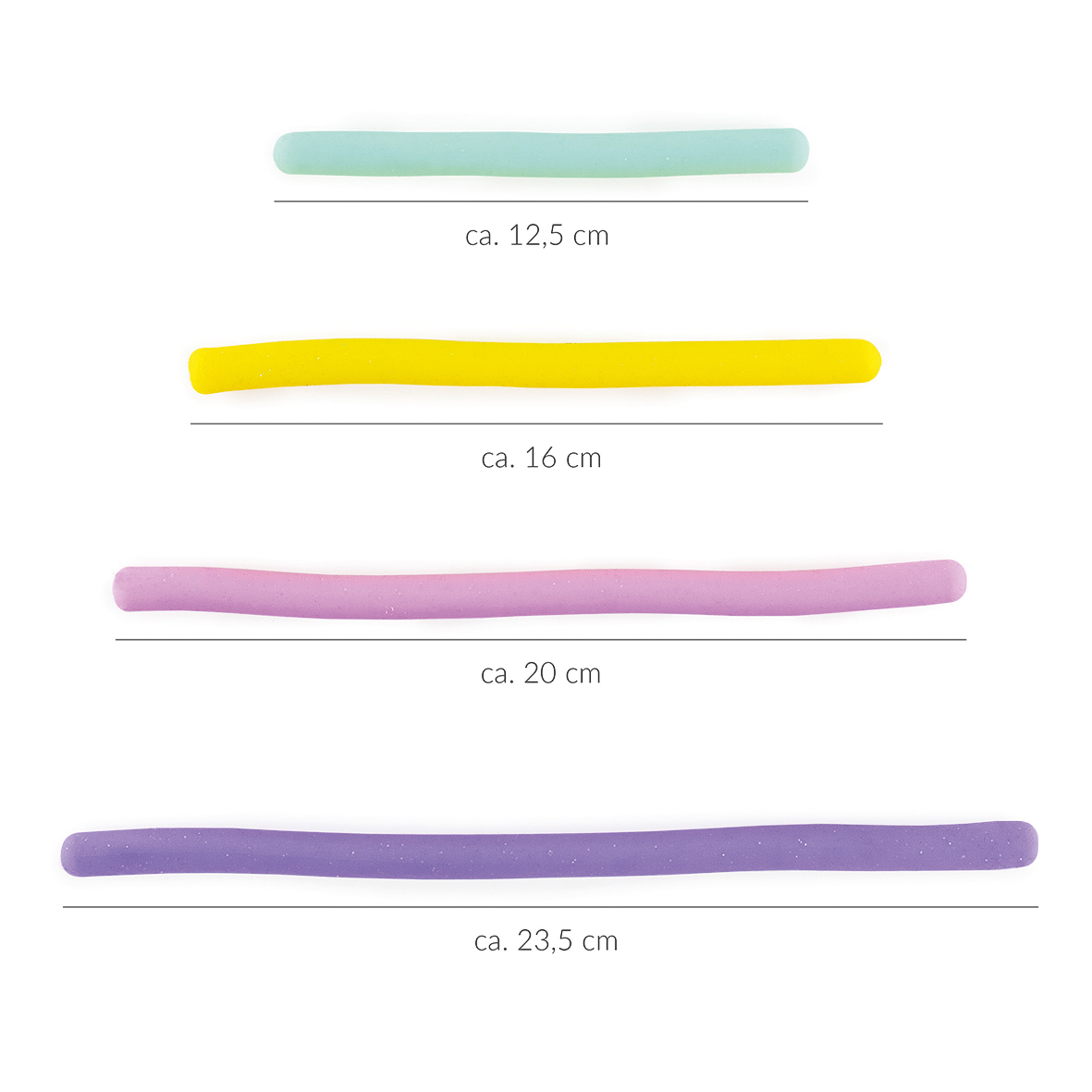 Relax, be Happy and feel good mit der Anti-Langeweile-Glitzerschnur für Jung und Alt - zum Stretchen, Knoten und vieles mehr! Die Powerschnur im praktischen 4er Set mit 4 trendigen Pastellfarben ist bis auf das 8-fache ihrer Länge dehnbar. Verschiedene Längen von ca. 12,5 cm bis 23 cm.