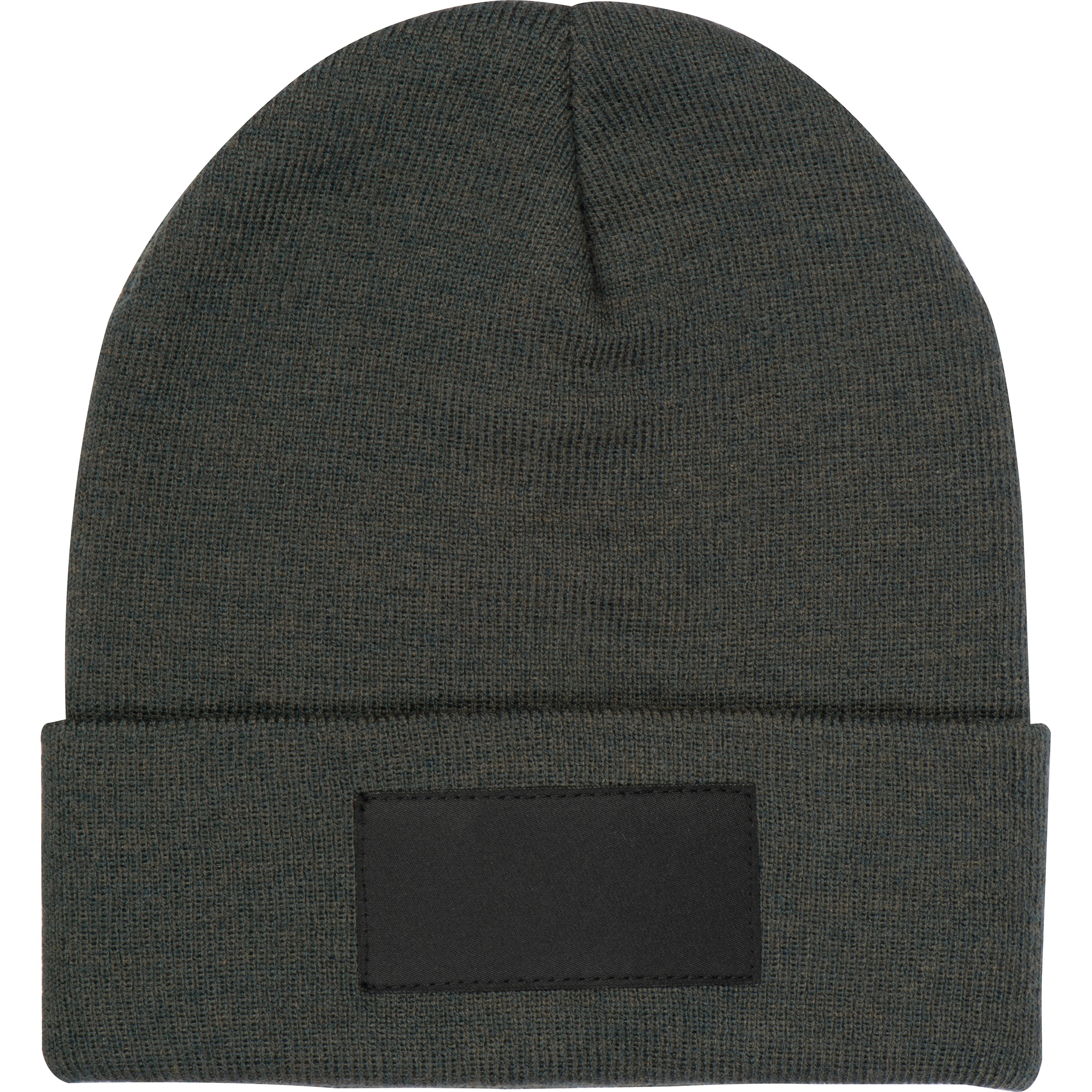 Strickmütze aus RPET und Acryl mit schwarzem Patch. Durch das elastische Material für fast alle Größen geeignet. Ihre Werbung drucken wir auf das Patch.