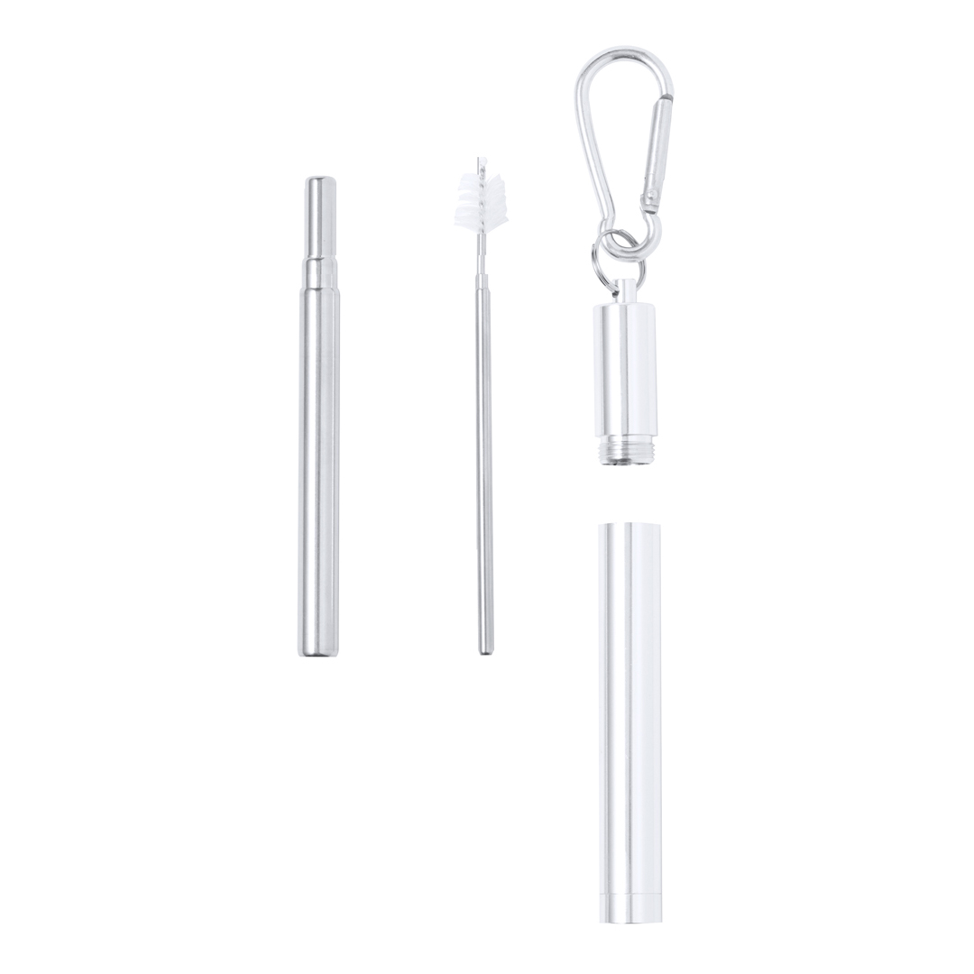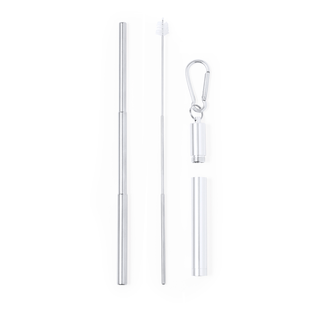 Wiederverwendbarer und ausziehbarer Edelstahlstrohhalm mit Silikonmundstück. Mit Reinigungszubehör im Lieferumfang enthalten und im passenden Koffer mit Karabiner zum Transport präsentiert.