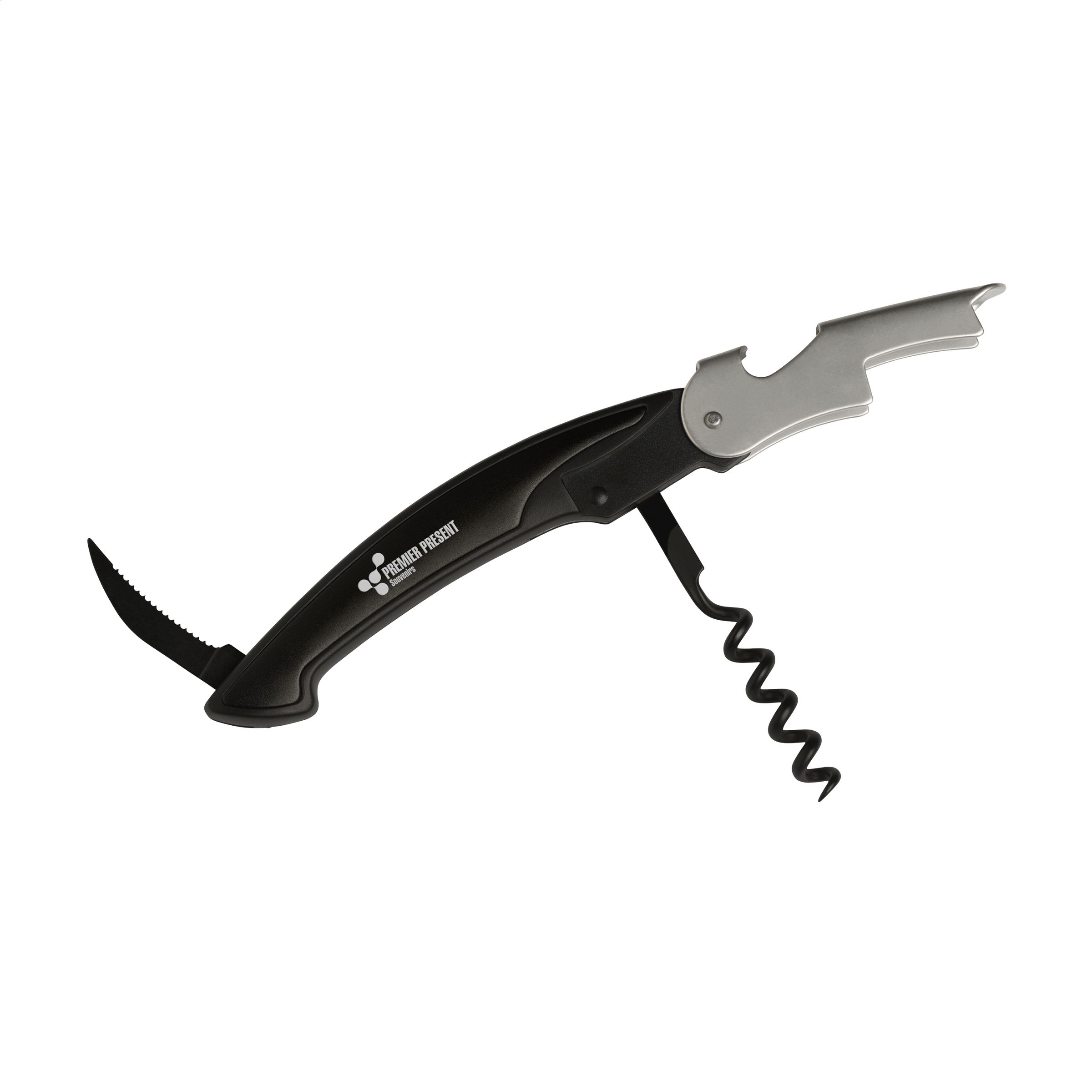 Exquisites Design - ausklappbares Kellnermesser aus rostfreiem Stahl mit Aluminium. Mit Korkenzieher, Flaschenöffner und Folienschneider. Wird einzeln in einem Kraftkarton geliefert.